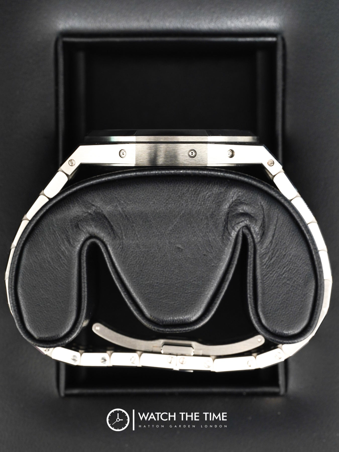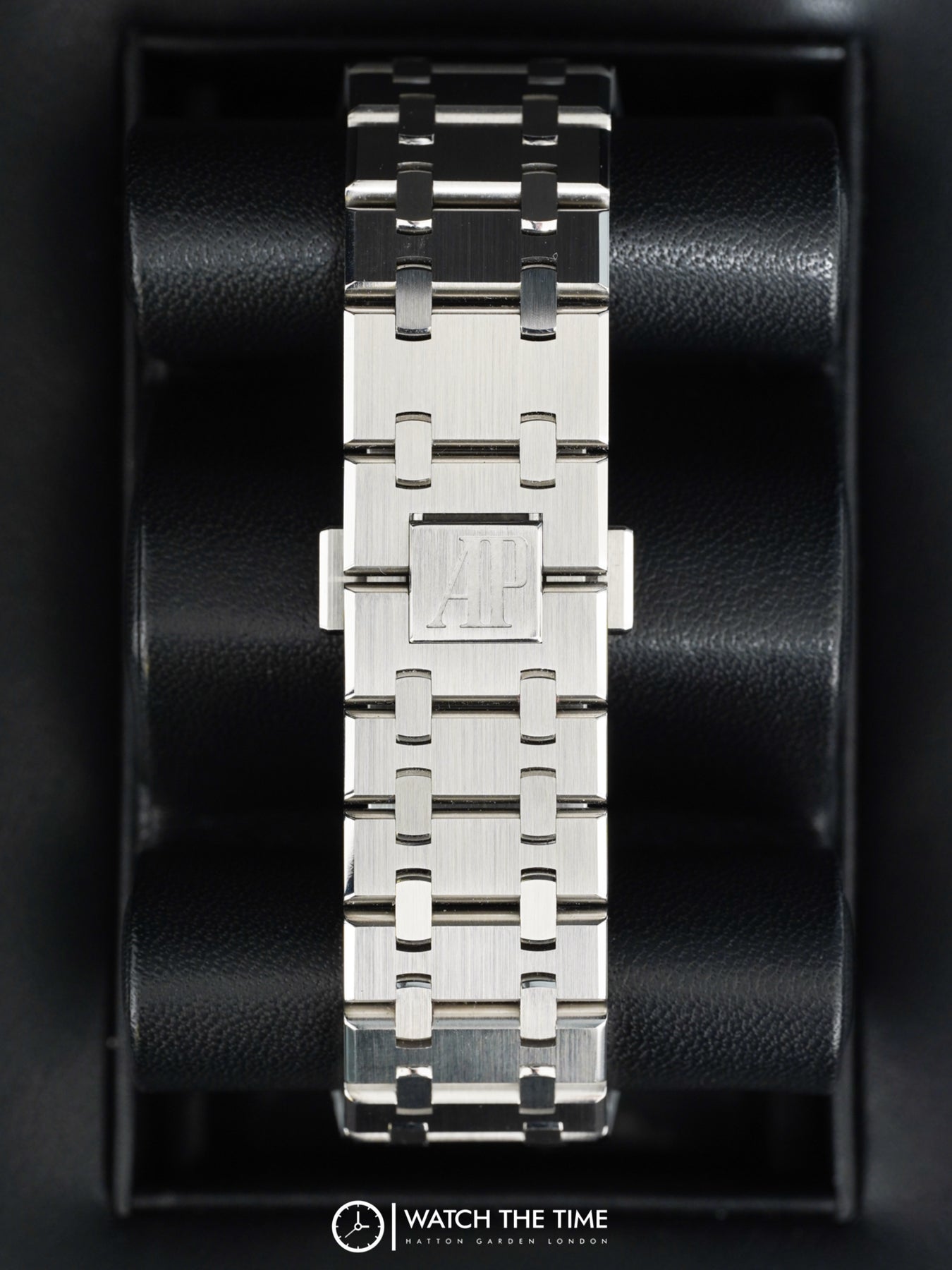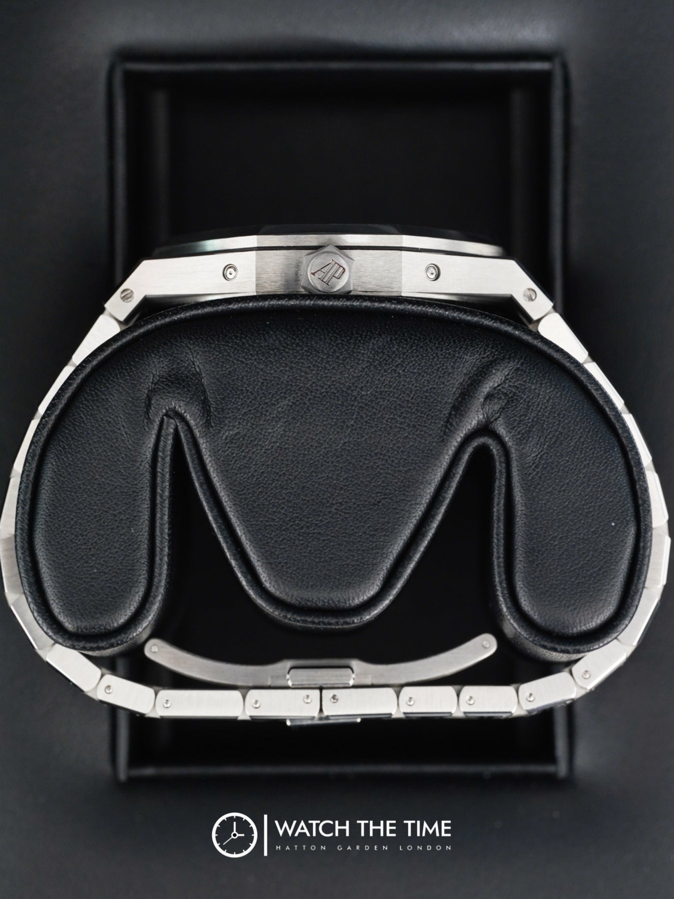 41mm stainless steel case, Royal Oak Perpetual Calendar. Crown set on the right side of the watch. Blue dial, stainless steel bracelet.