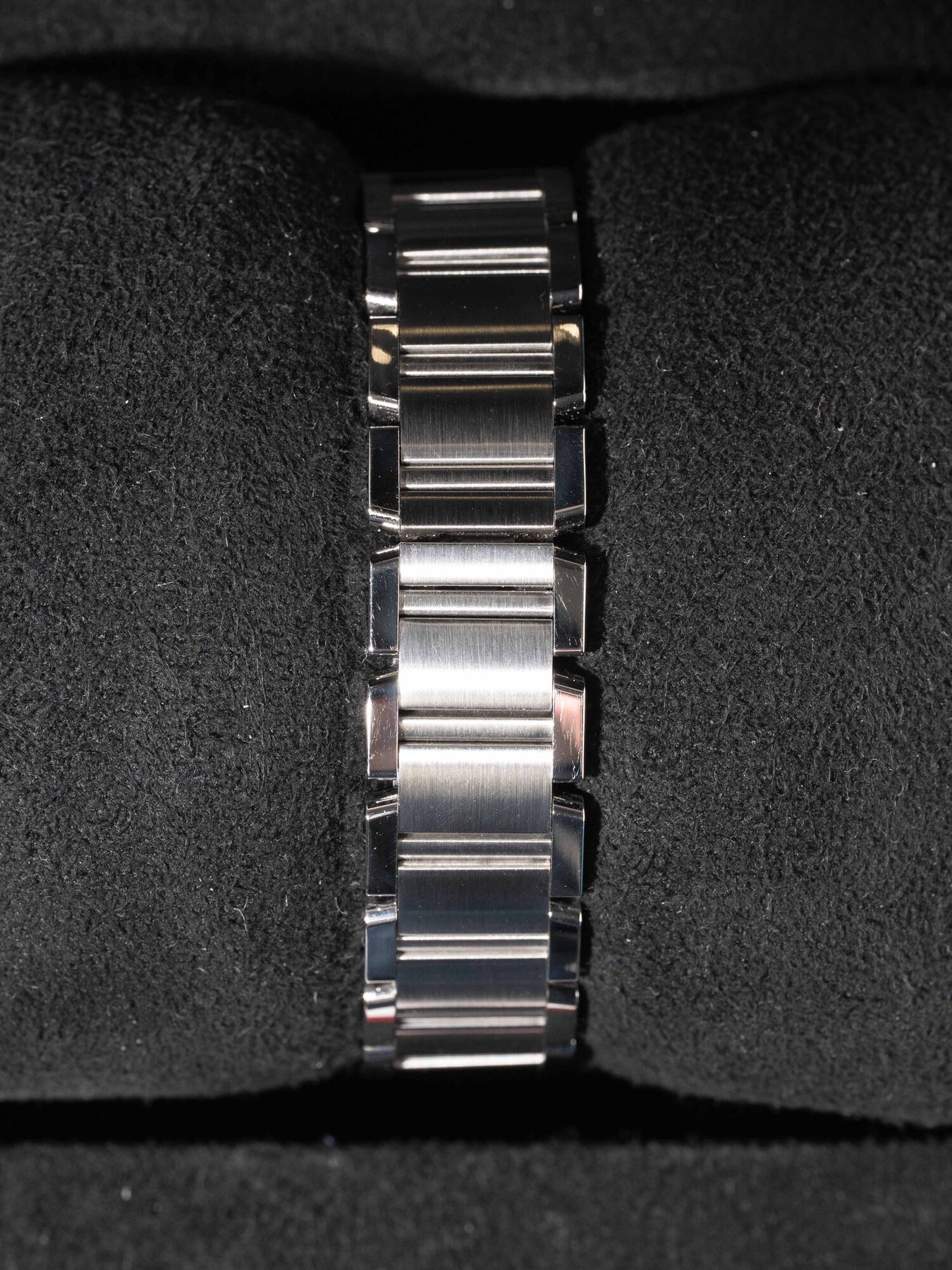 25mm stainless steel case, crown set on the right side of the watch. White roman dial, stainless steel bracelet.