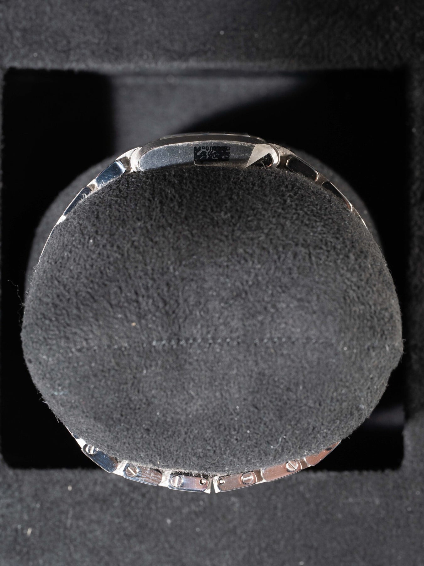 25mm stainless steel case, crown set on the right side of the watch. White roman dial, stainless steel bracelet.