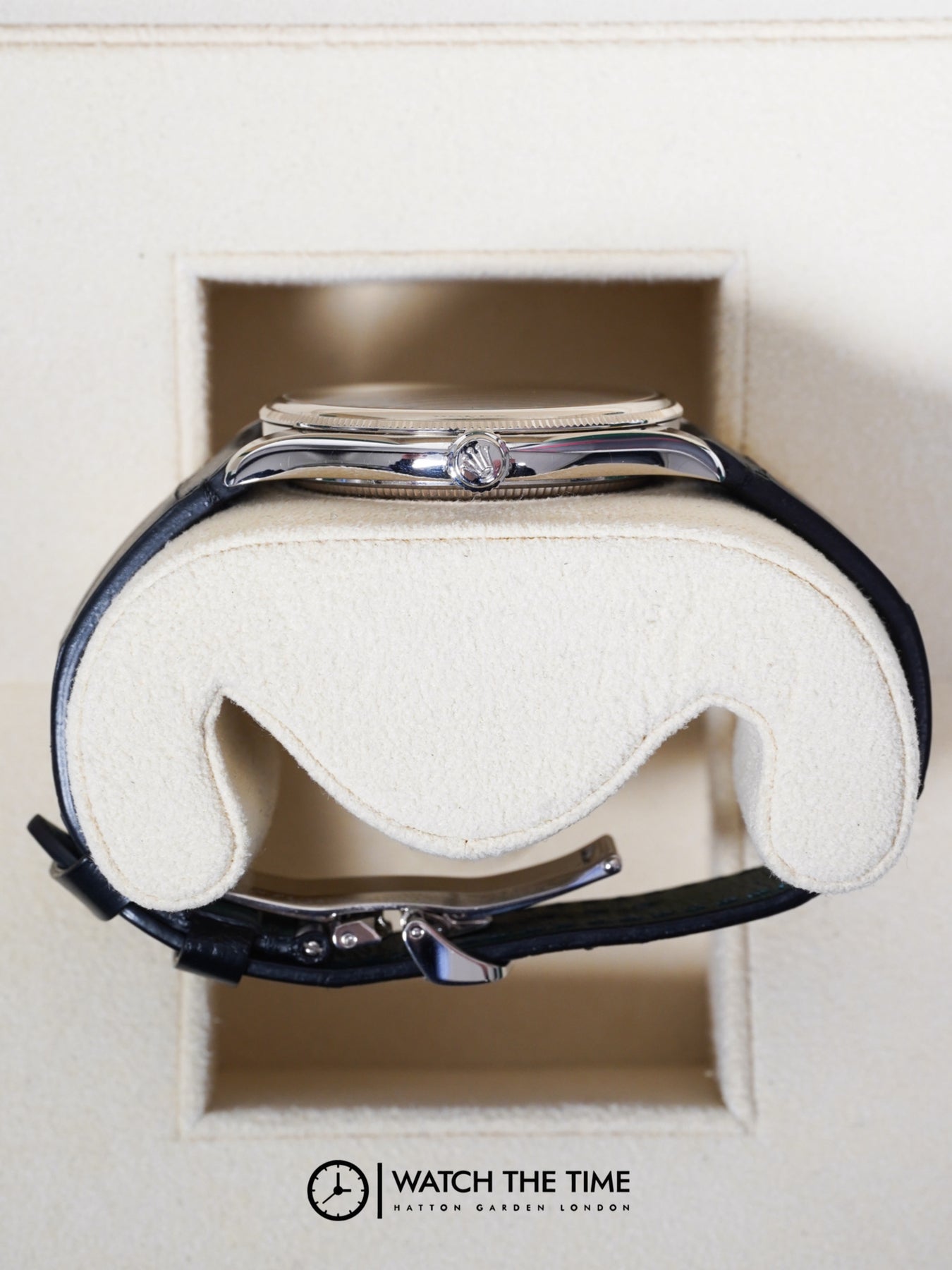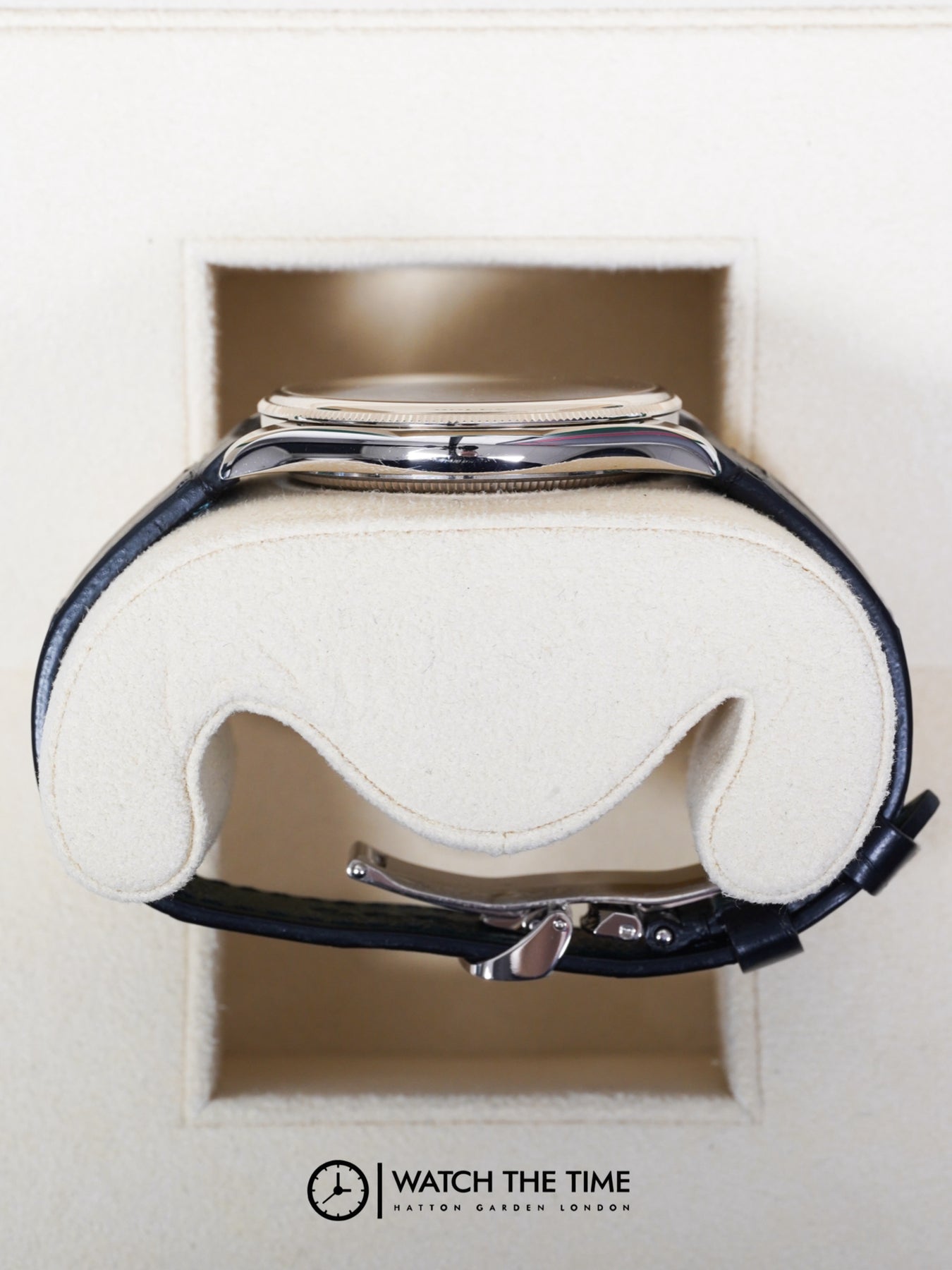 39mm white gold case, white gold bezel. Crown set on the right side of the watch. Black dial, black leather strap.