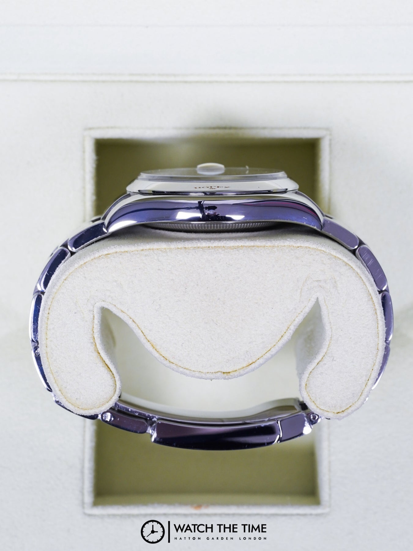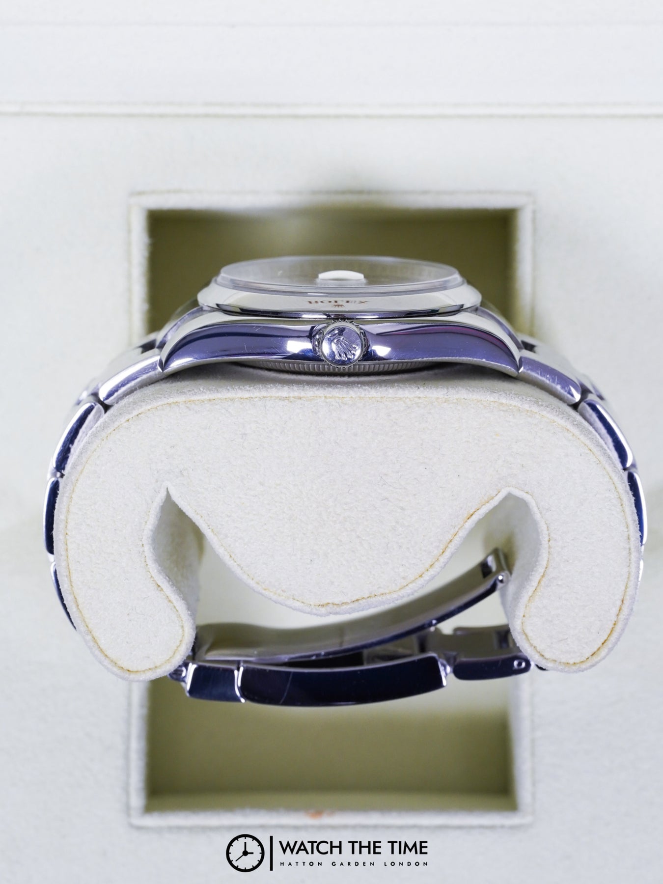 36mm stainless steel case, smooth bezel. Crown set on the right side of the watch as well as the date. Blue Roman dial, stainless steel oyster bracelet.