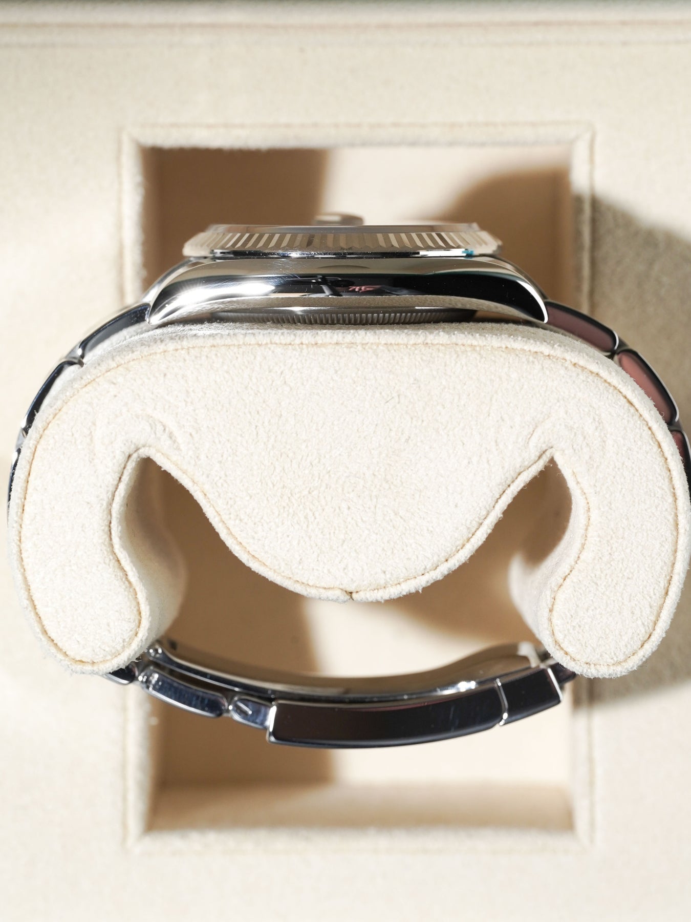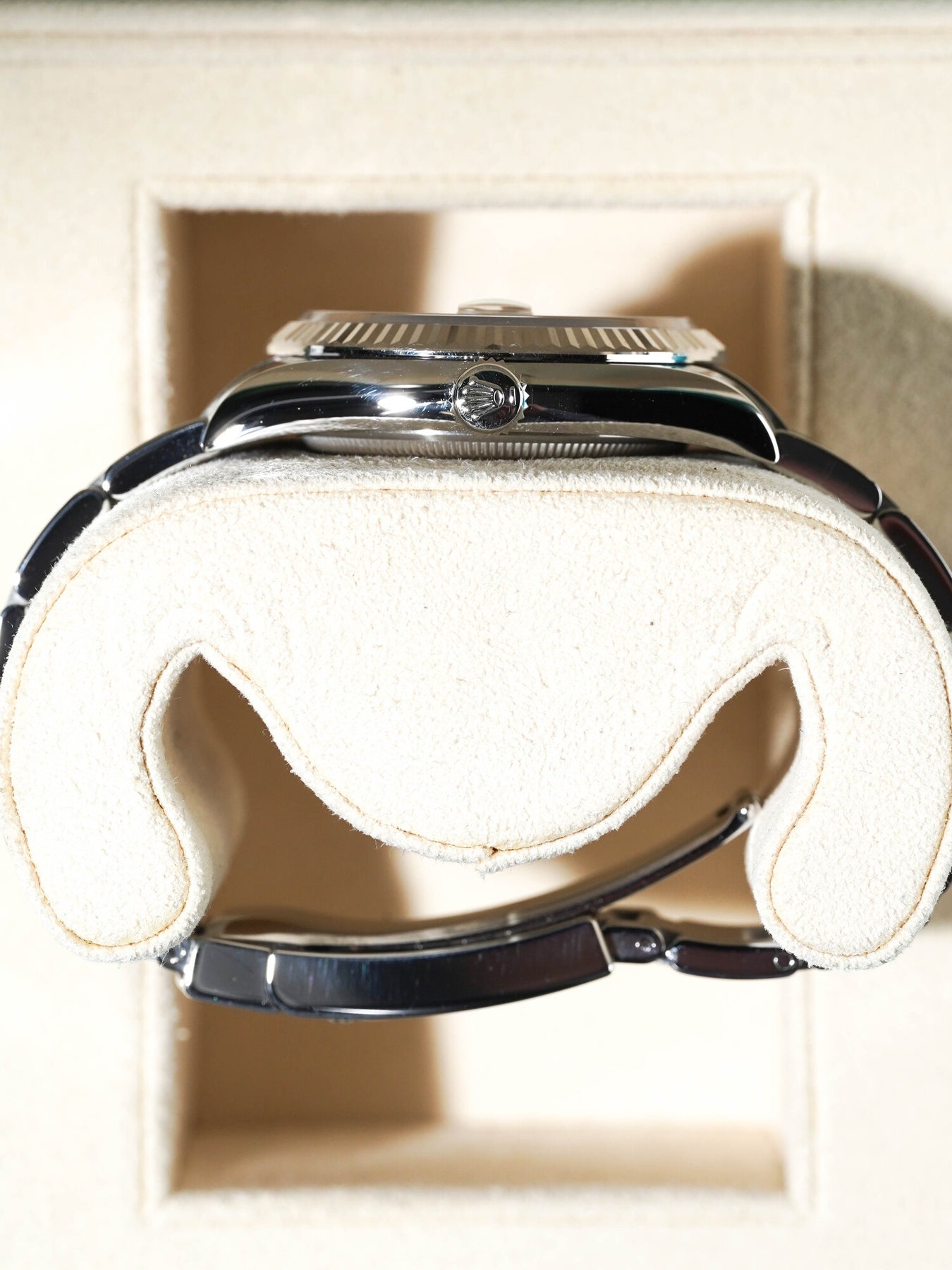36mm stainless steel case, white gold fluted bezel. Crown set on the right side of the watch as well as the date. Green dial, stainless steel oyster bracelet.