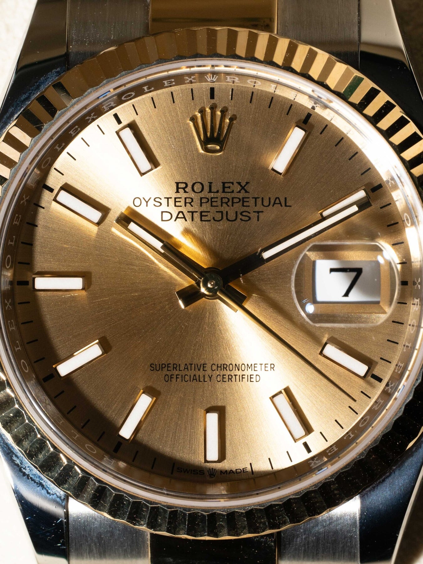 36mm stainless steel & yellow gold case, yellow gold fluted bezel. Crown set on the right side of the watch as well as the date. Champagne dial, stainless steel & yellow gold oyster bracelet.