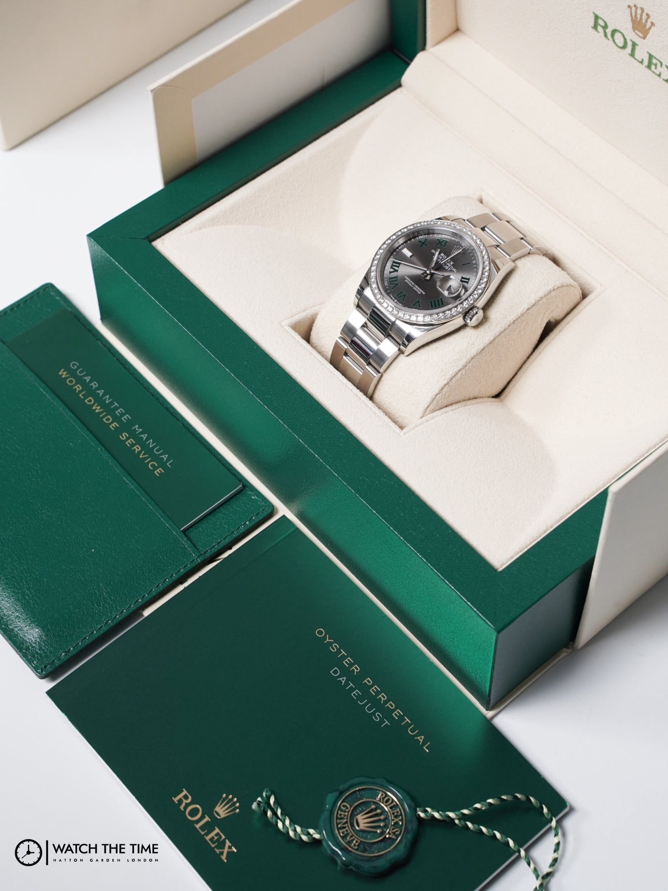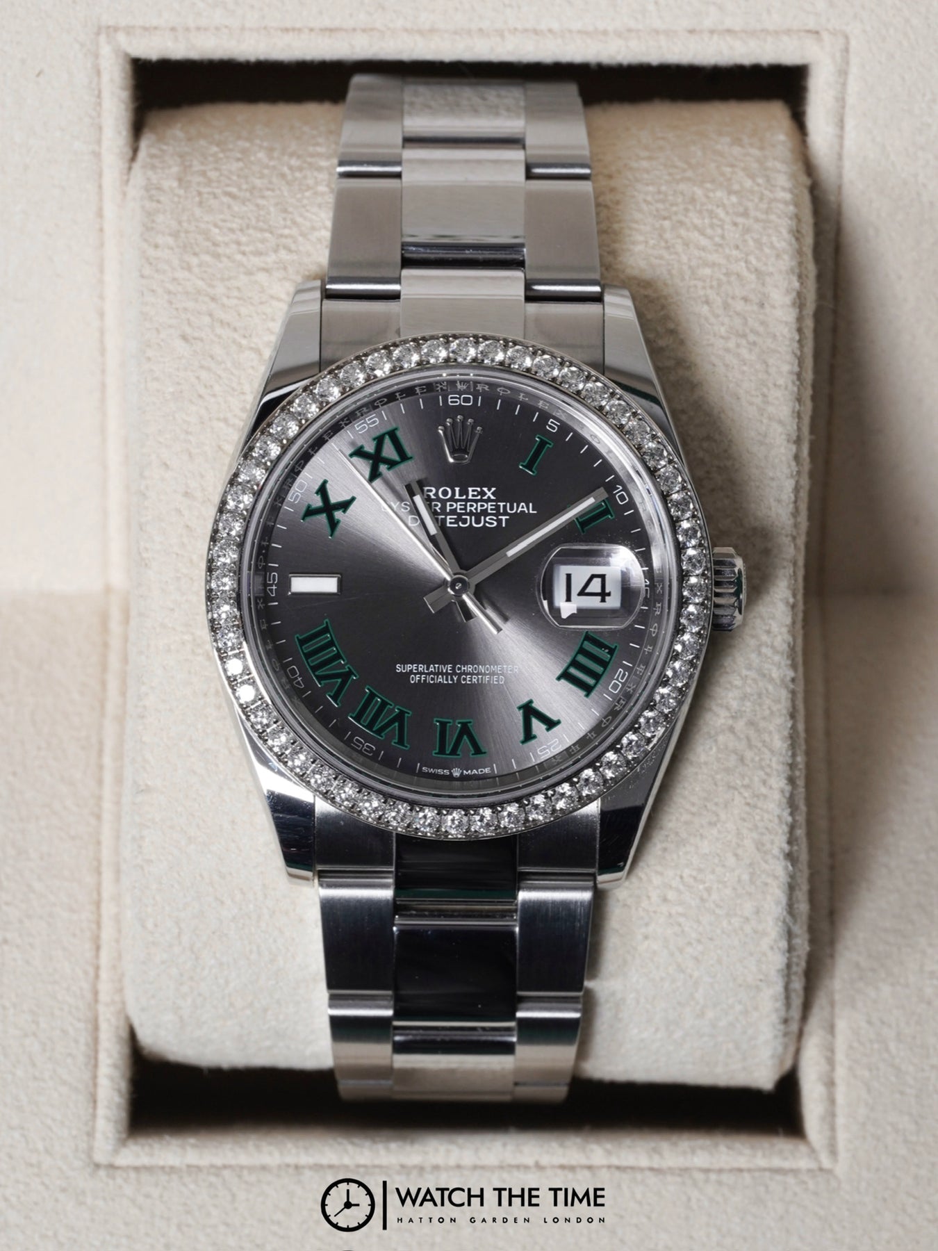 36mm stainless steel case, diamond RBR bezel. Crown set on the right side of the watch as well as the date. Wimbledon dial, stainless steel oyster bracelet.
