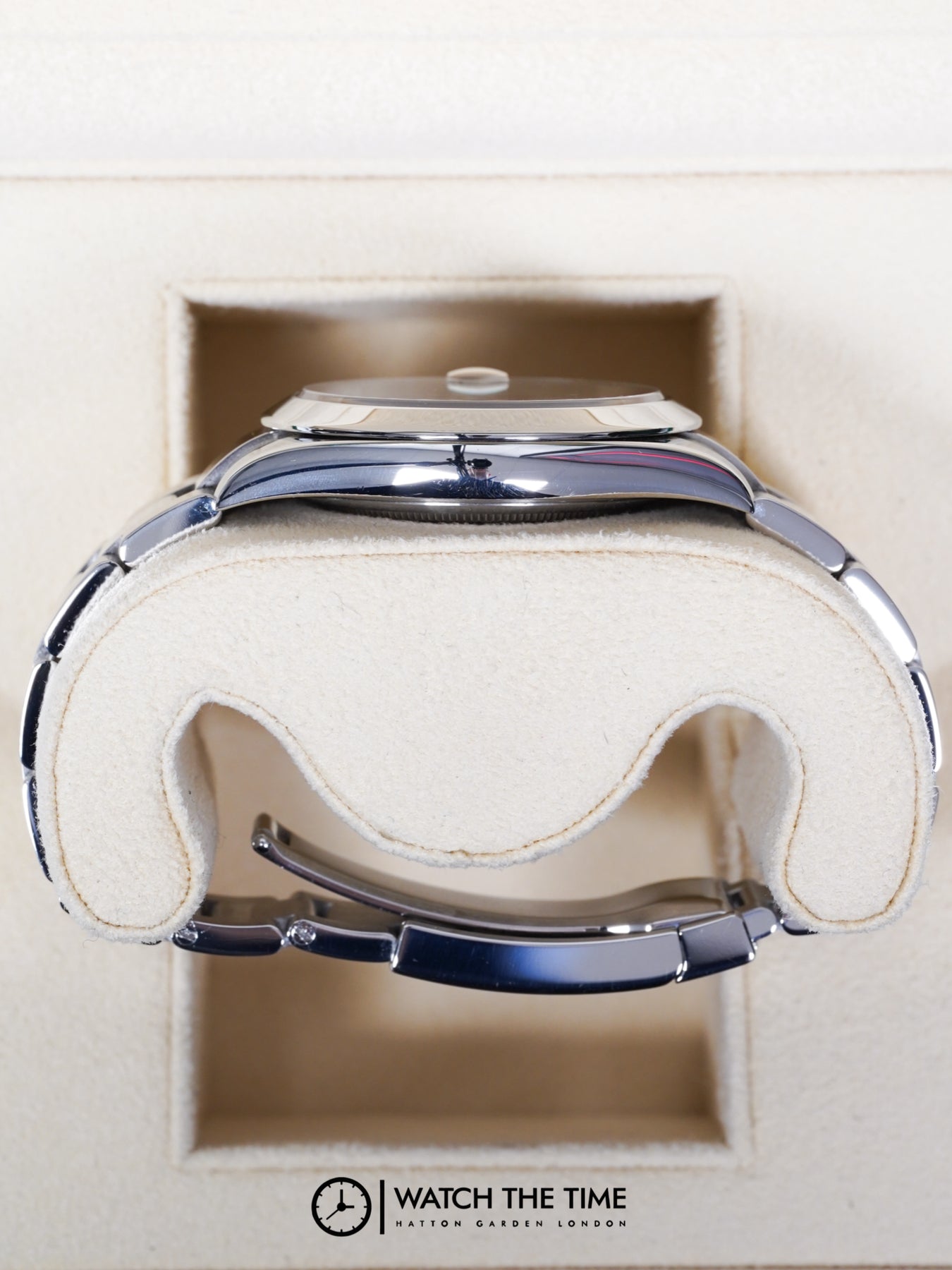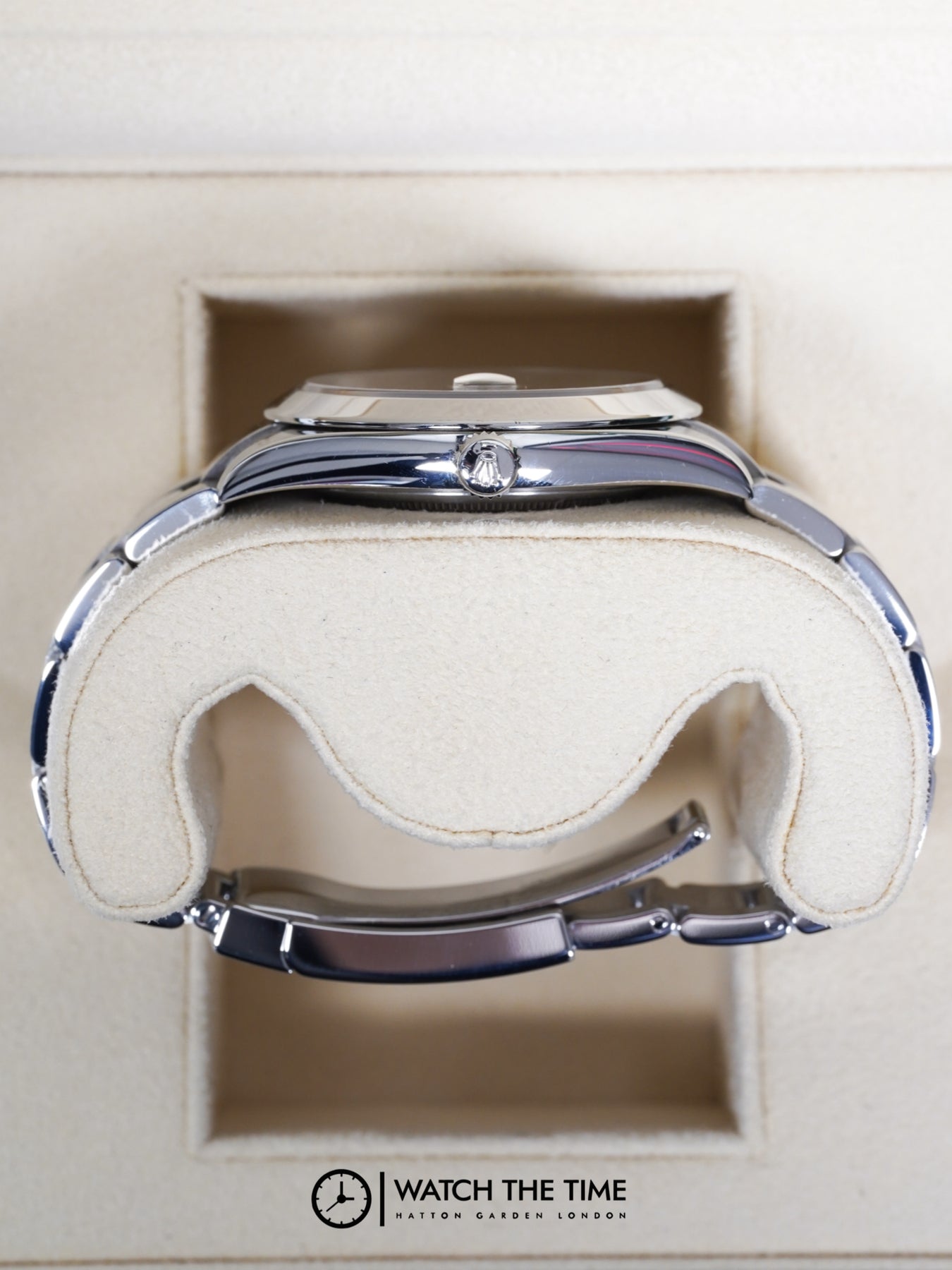 41mm stainless steel case, smooth bezel. Crown set on the right side of the watch as well as the date. Blue Dial, stainless steel oyster bracelet.