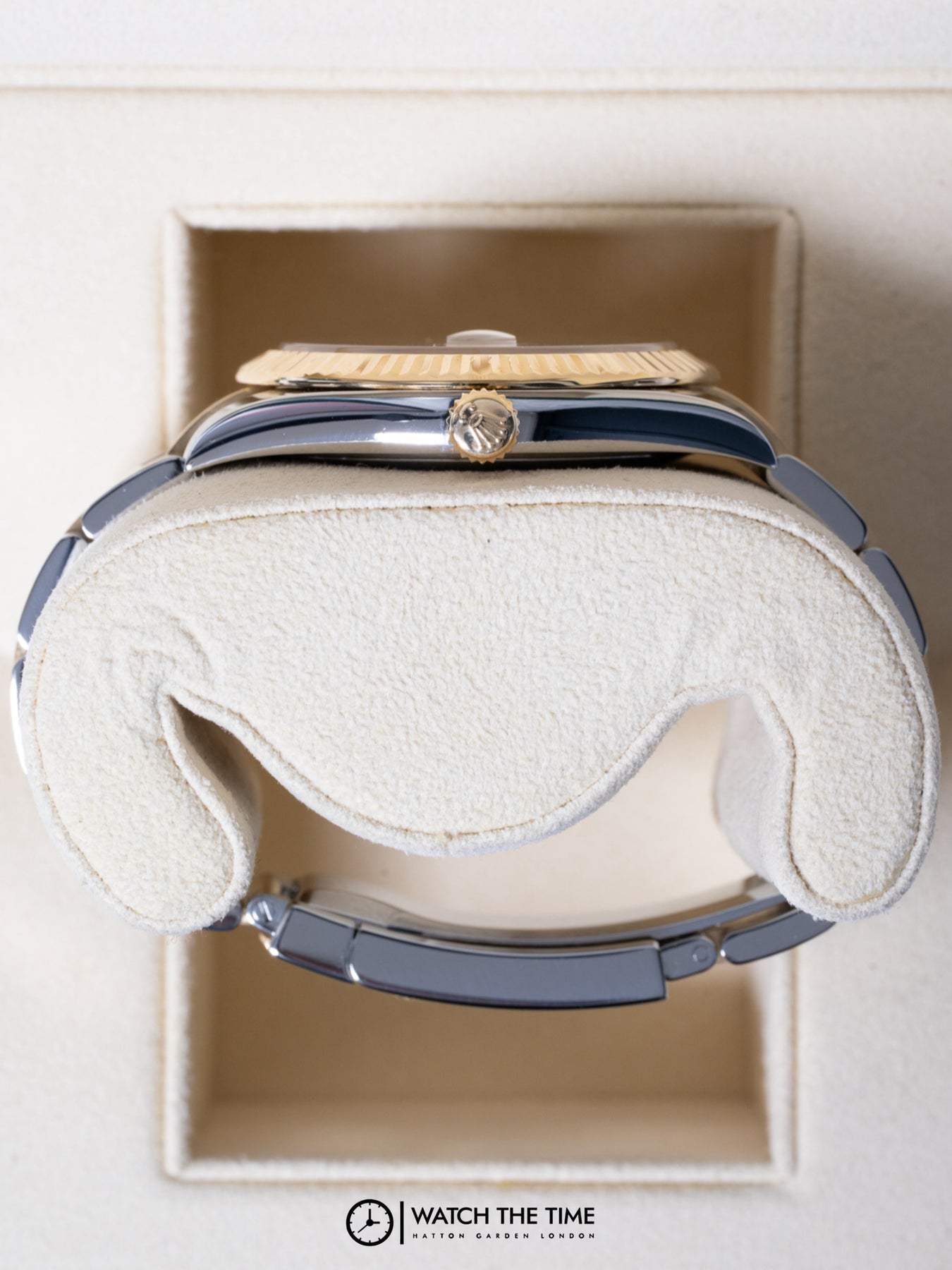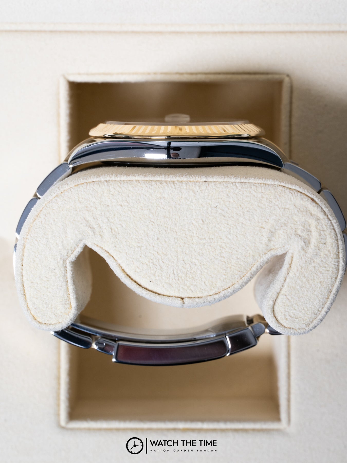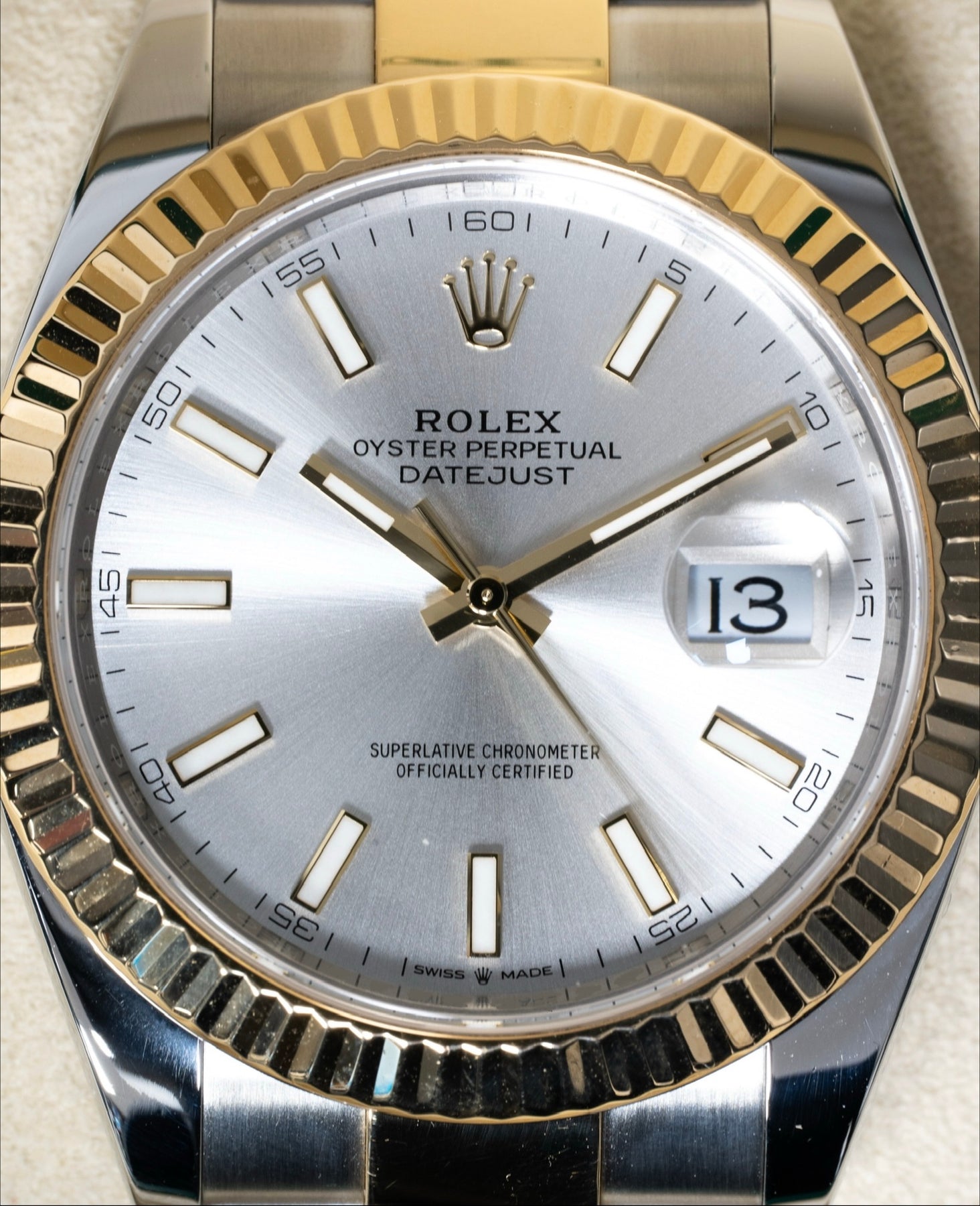 41mm stainless steel & yellow gold case, yellow gold fluted bezel. Crown set on the right side of the watch as well as the date. Silver dial, stainless steel & yellow gold oyster bracelet.