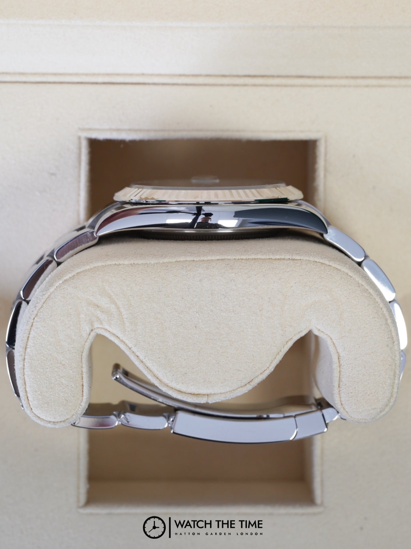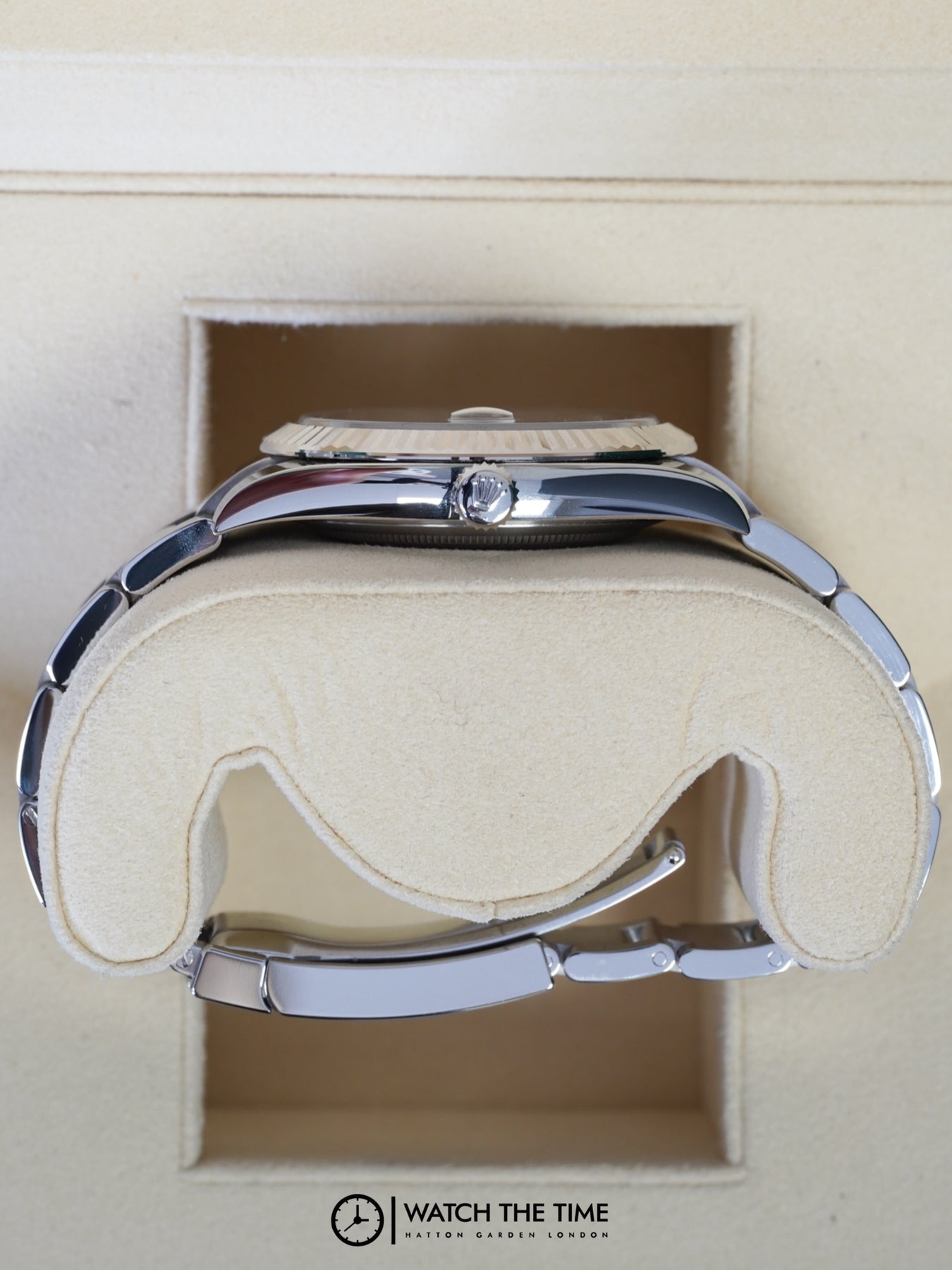 41mm stainless steel case, white gold fluted bezel. Crown set on the right side of the watch as well as the date. Black diamond dial, stainless steel oyster bracelet.