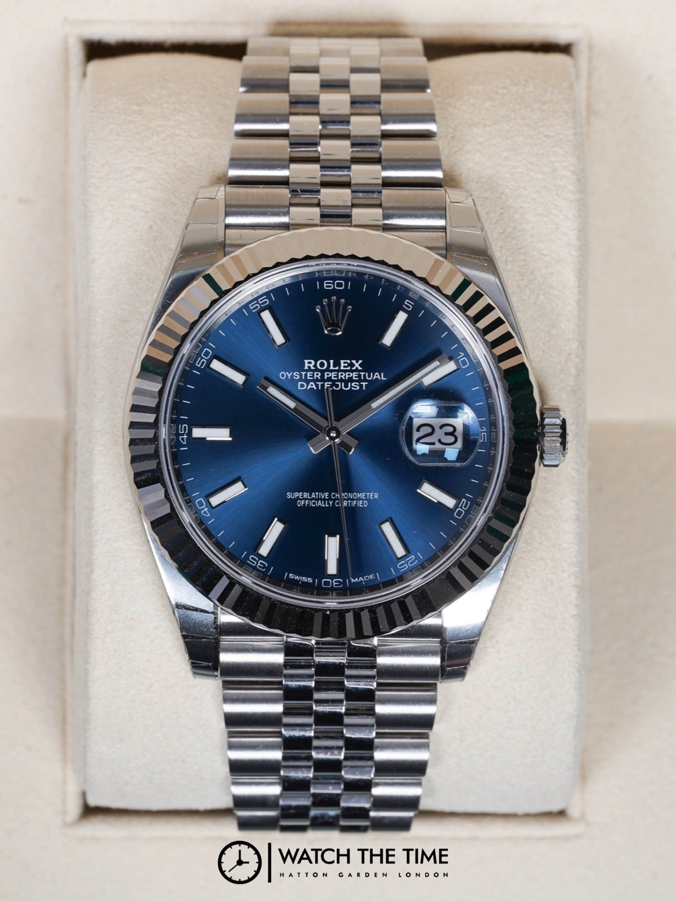 41mm stainless steel case, white gold fluted bezel. Crown set on the right side of the watch as well as the date. Blue baton dial, stainless steel jubilee bracelet.
