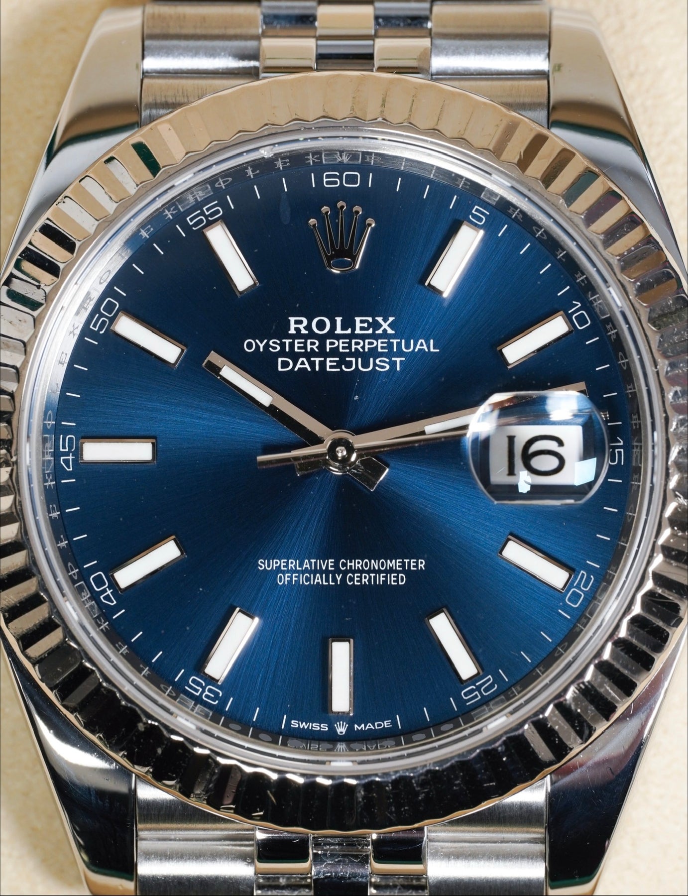 41mm stainless steel case, white gold fluted bezel. Crown set on the right side of the watch as well as the date. Blue dial, stainless steel jubilee bracelet.