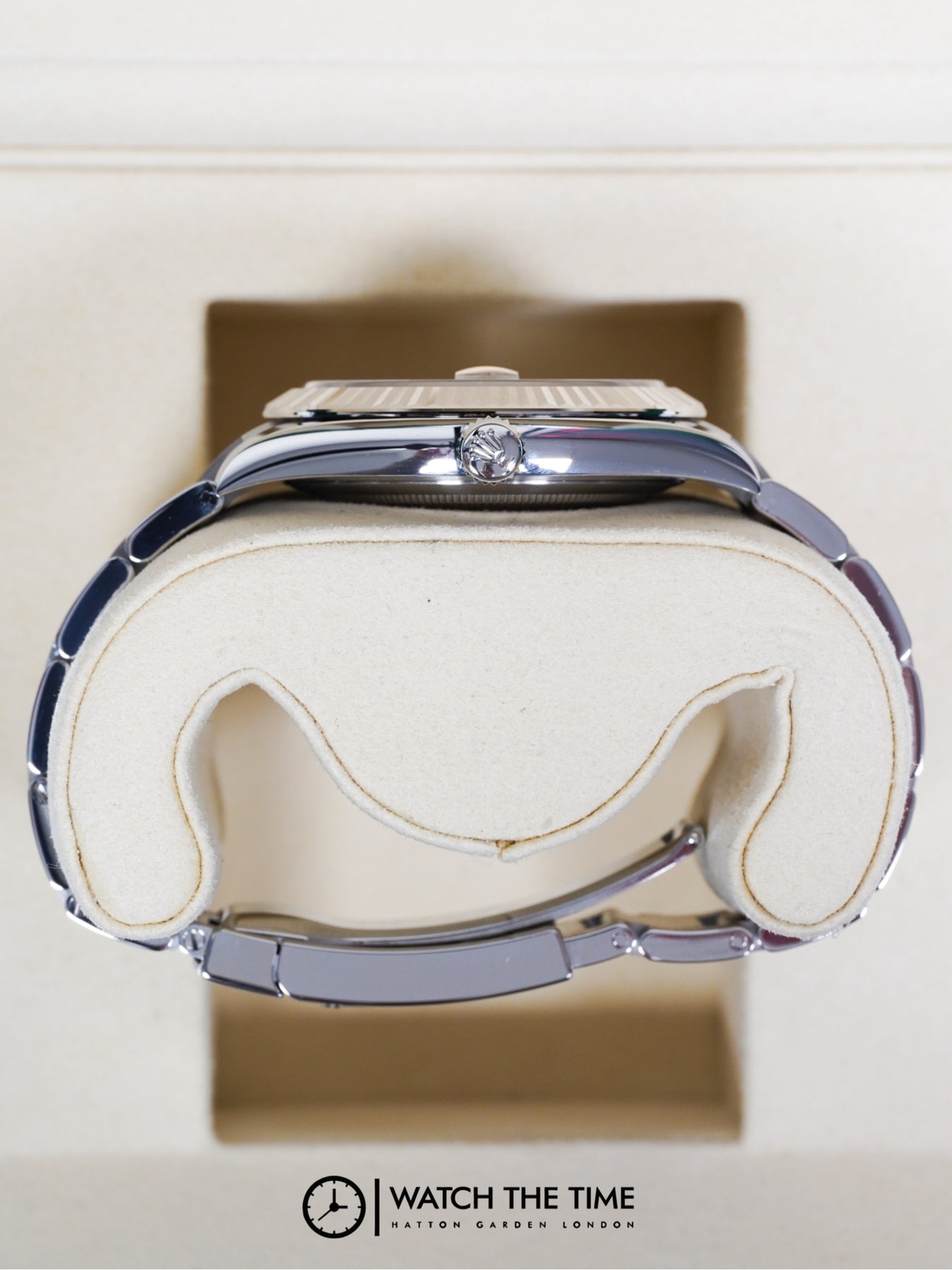 41mm stainless steel case, white gold fluted bezel. Crown set on the right side of the watch as well as the date. Wimbledon dial, stainless steel oyster bracelet.
