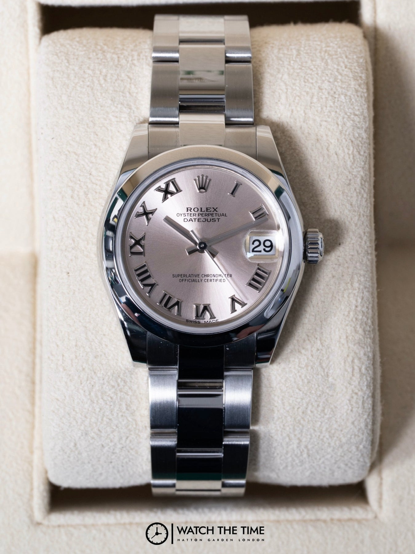 31mm stainless steel case, smooth bezel. Crown set on the right side of the watch as well as the date. Pink roman dial, stainless steel oyster bracelet.