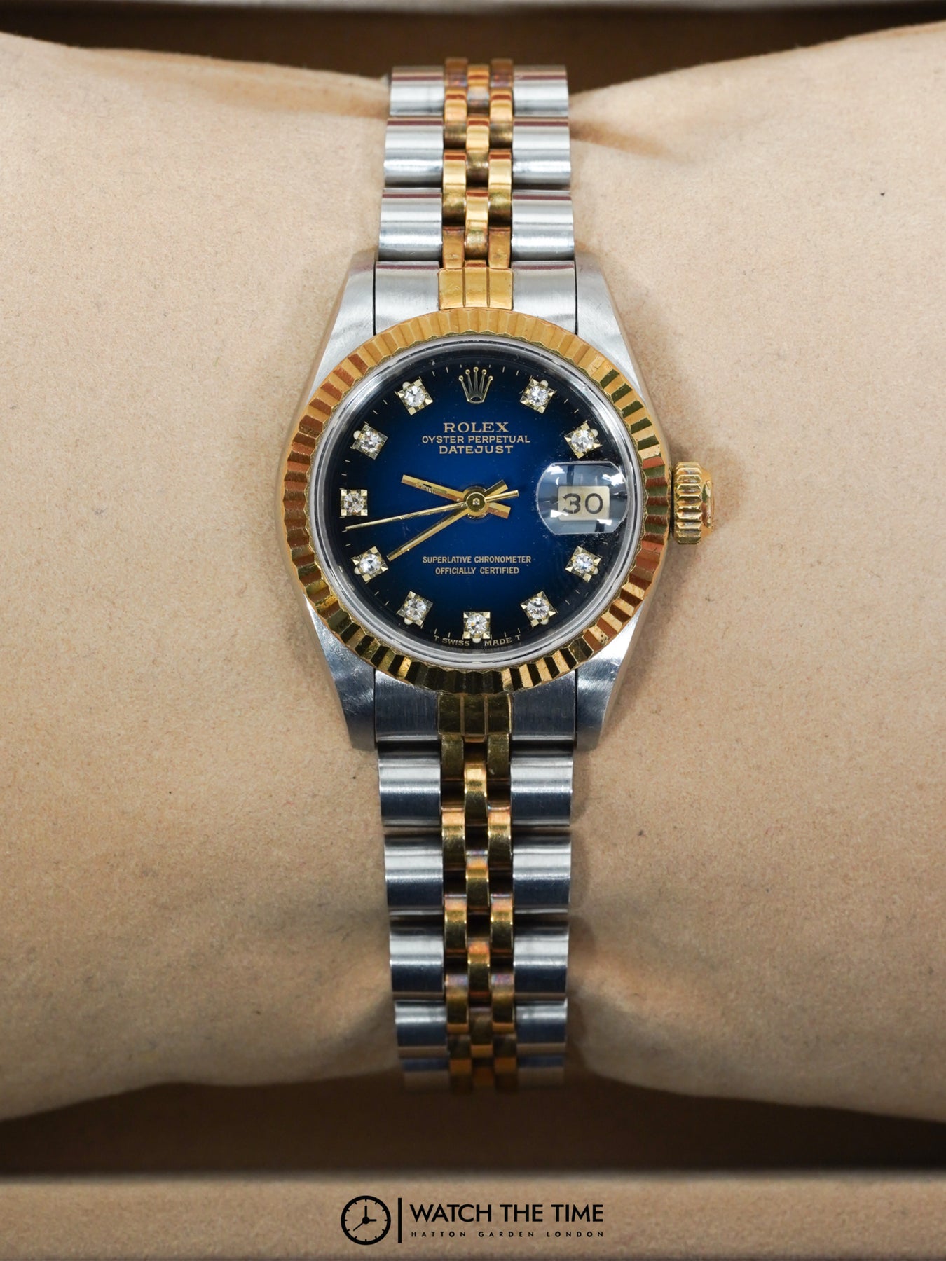 26mm stainless steel case, yellow gold fluted bezel. Crown set on the right side of the watch as well as the date. Blue diamond dial, yellow gold & stainless steel jubilee bracelet.