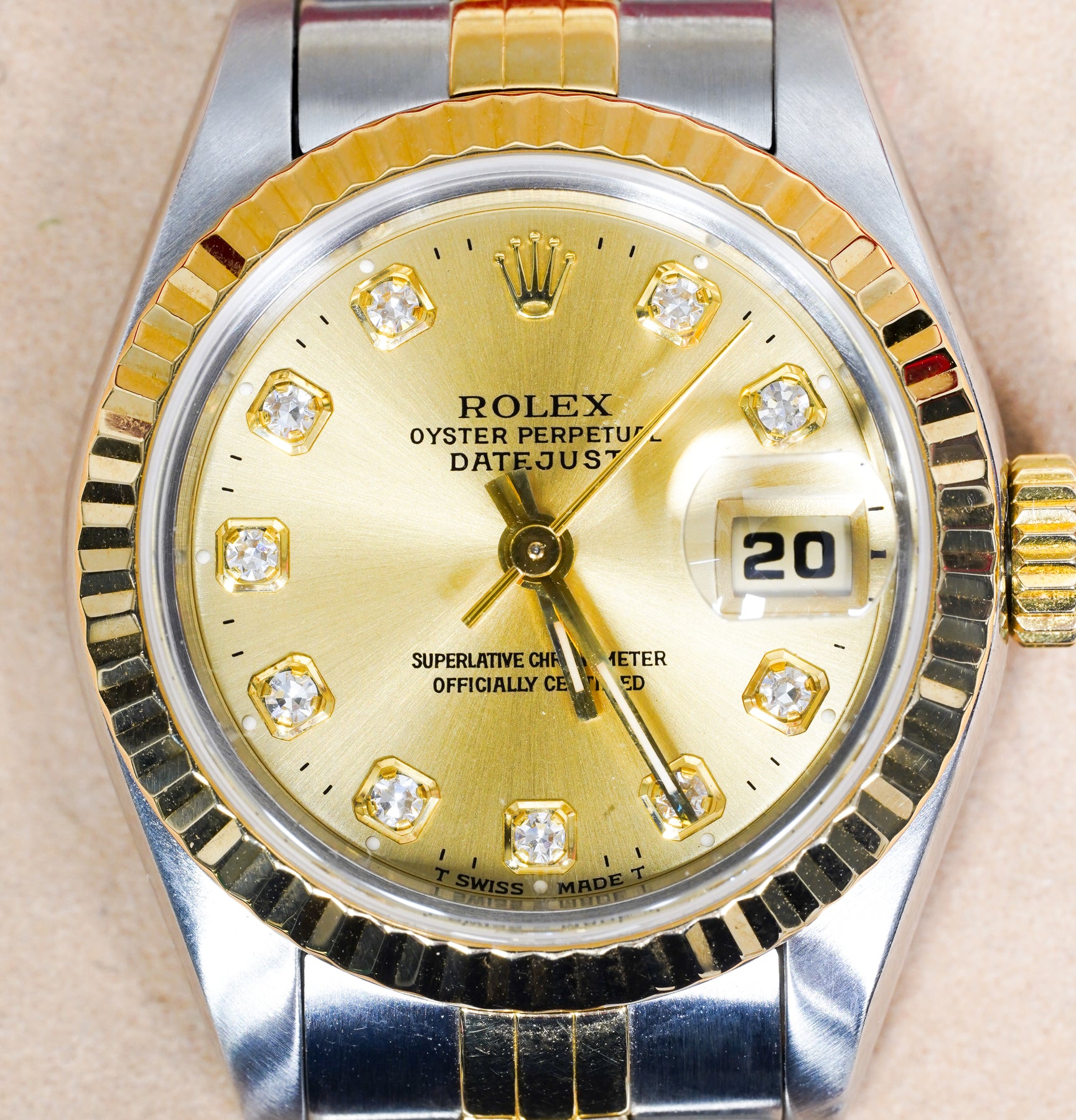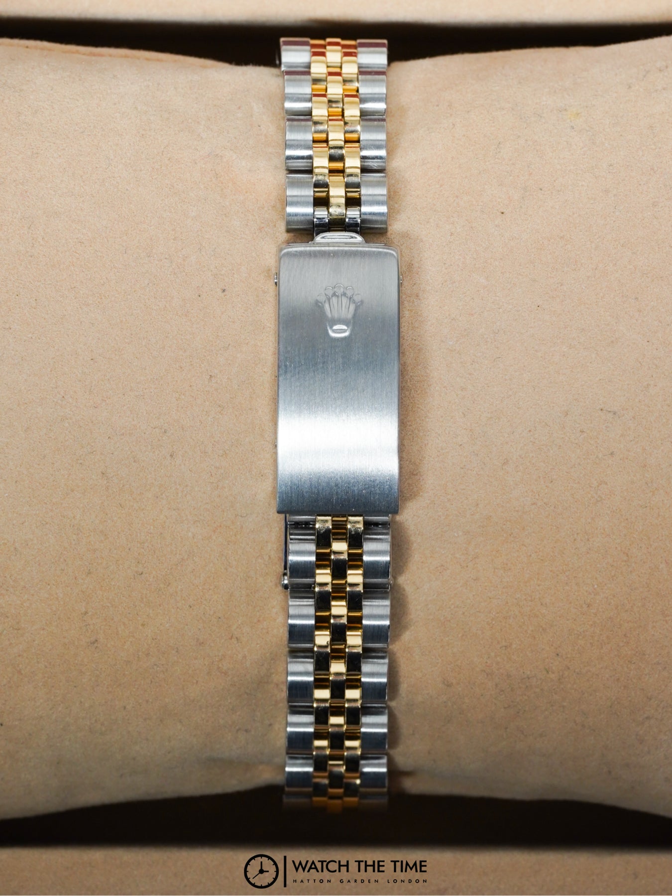 26mm stainless steel case, yellow gold fluted bezel, champagne diamond dial, crown set on the right side of the watch as well as the date. Yellow gold & stainless steel jubilee bracelet.
