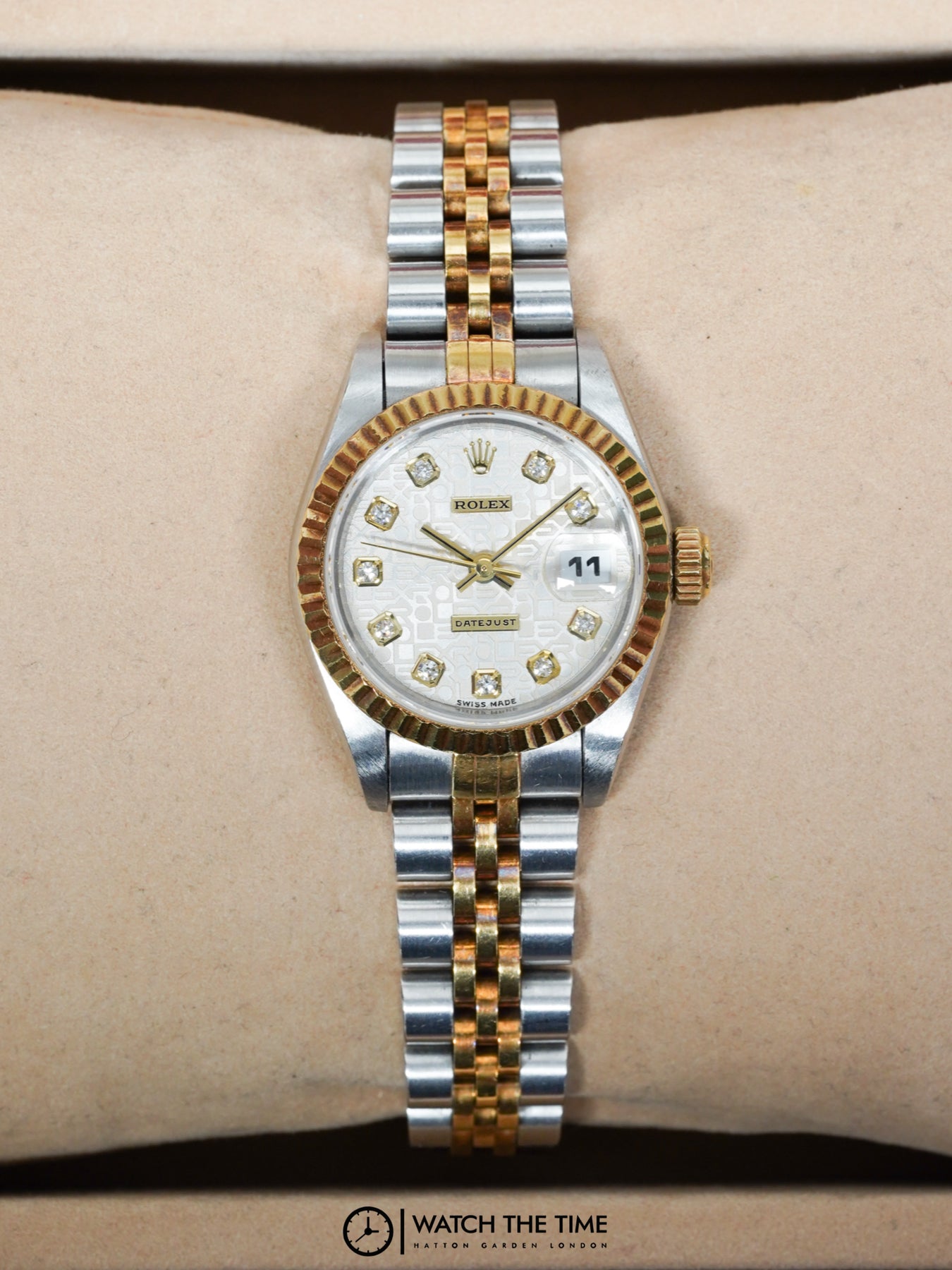 26mm stainless steel case, yellow gold fluted bezel. Crown set on the right side of the watch as well as the date. White jubilee diamond dial, yellow gold & stainless steel jubilee bracelet.