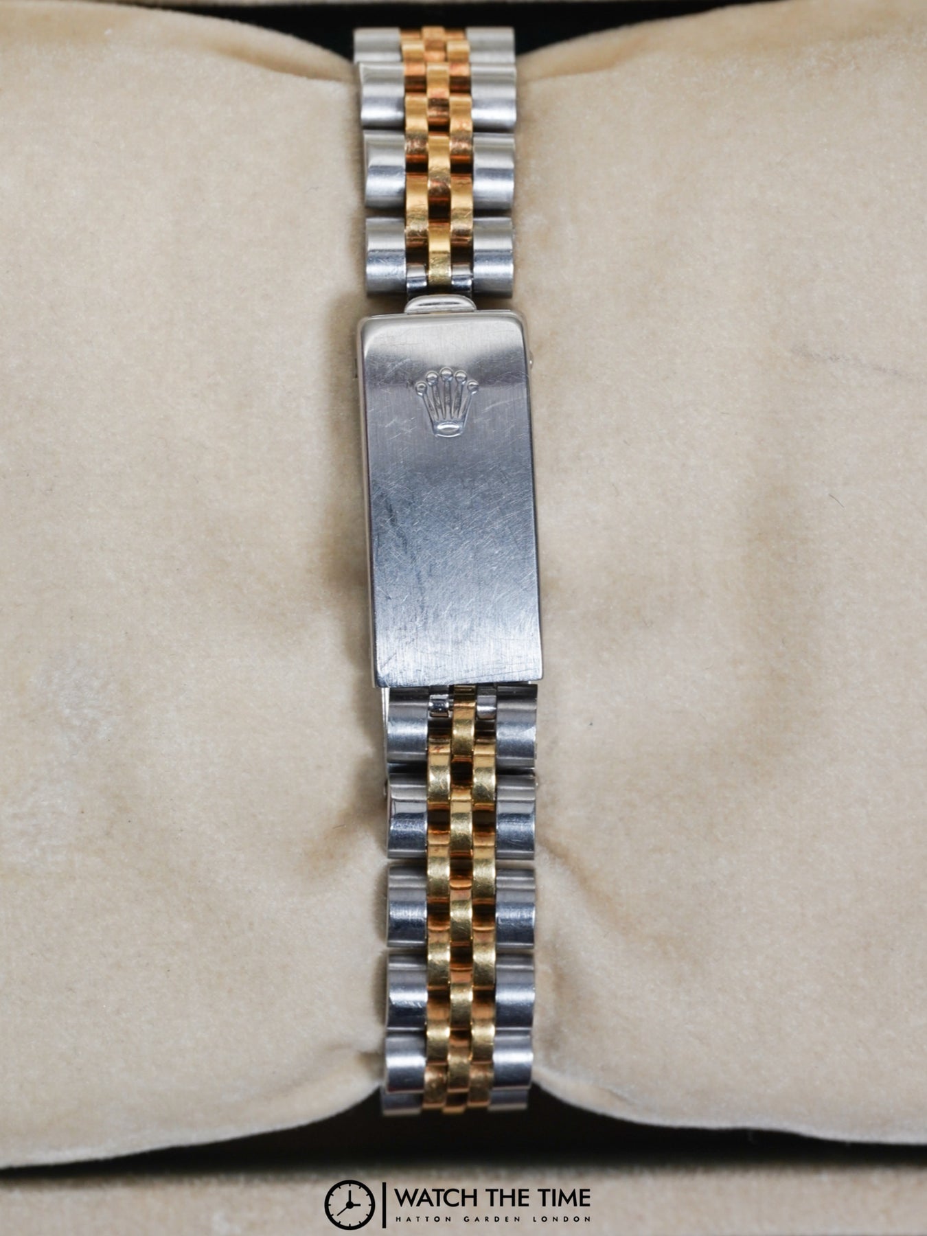 26mm stainless steel case, yellow gold fluted bezel. Crown set on the right side of the watch as well as the date. Blue diamond dial, yellow gold & stainless steel jubilee bracelet.