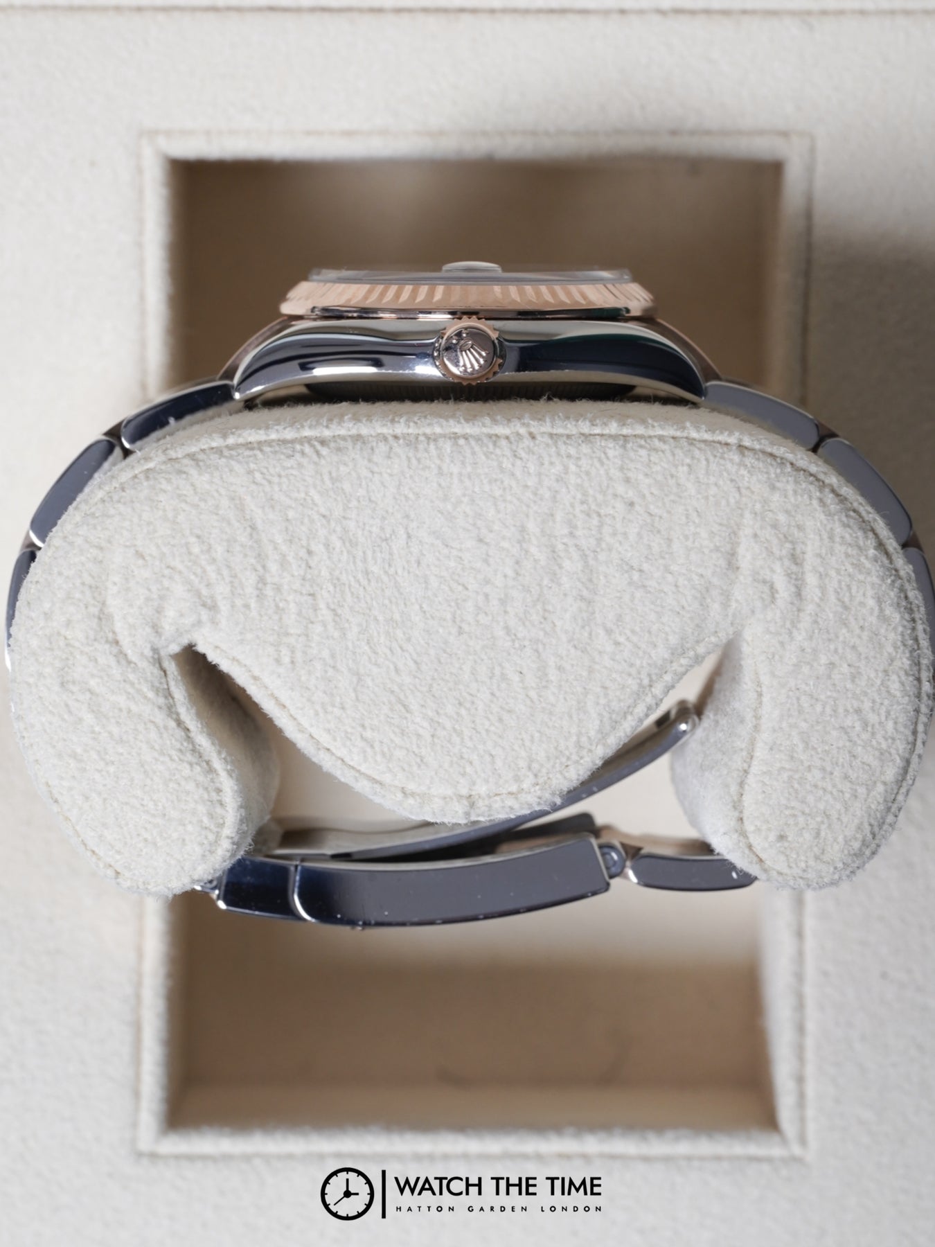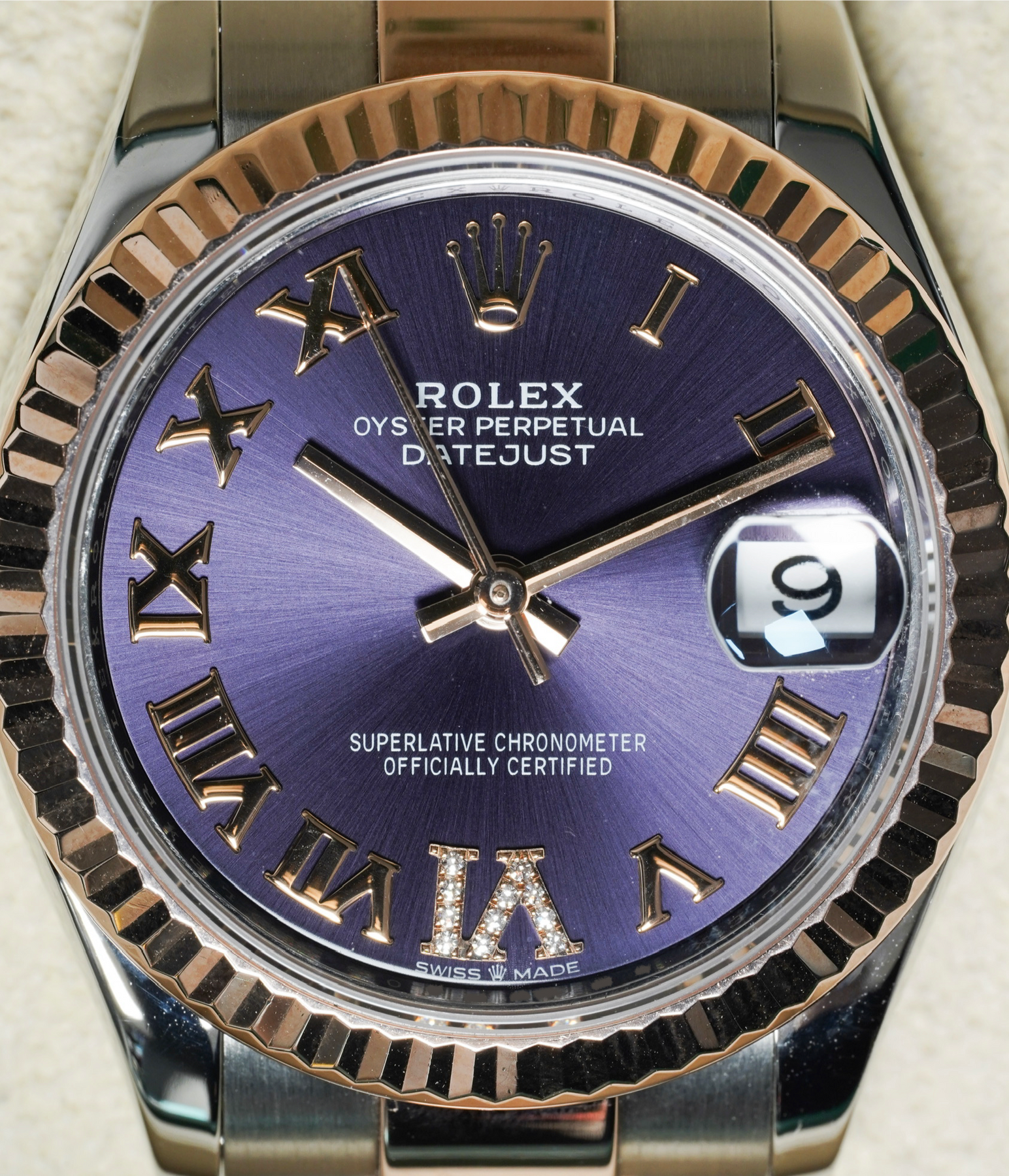 31mm rose gold & stainless steel case, rose gold fluted bezel. Crown set on the right side of the watch as well as the date. Aubergine diamond 6 dial, rose gold & stainless steel oyster bracelet.