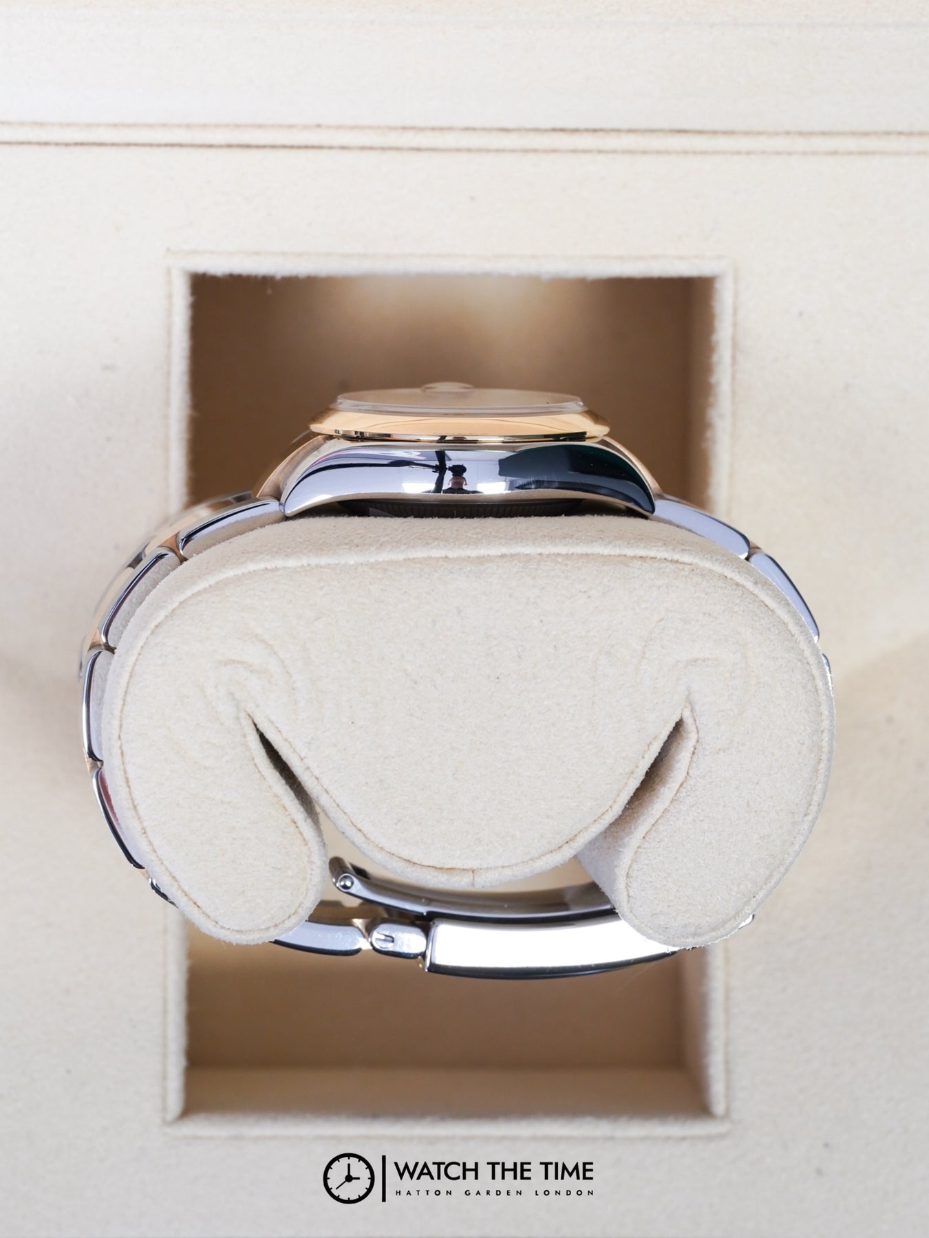 28mm stainless steel & yellow gold case, yellow gold smooth bezel. Crown set on the right side of the watch as well as the date. Champagne baton dial, yellow gold & stainless steel oyster bracelet.