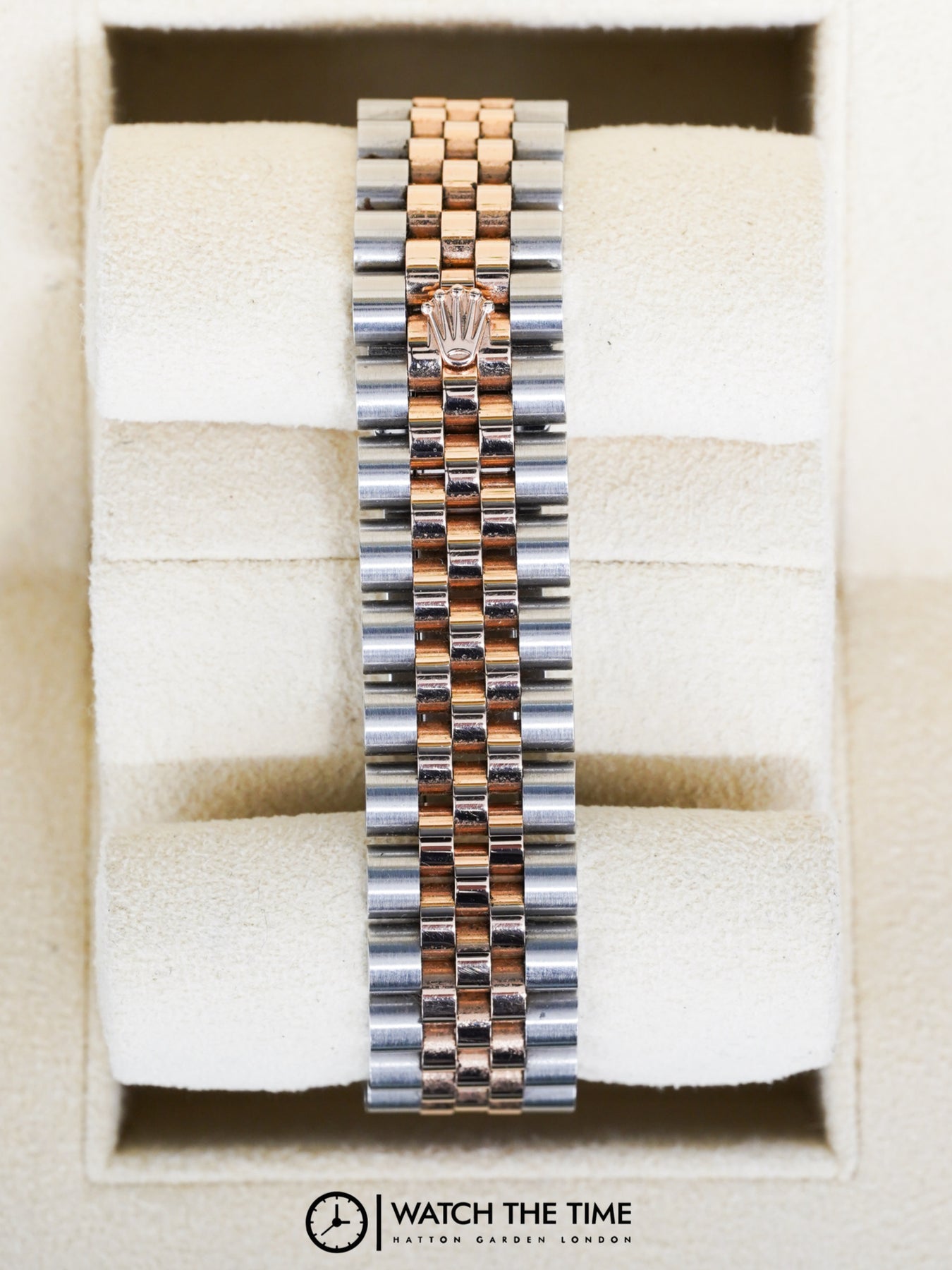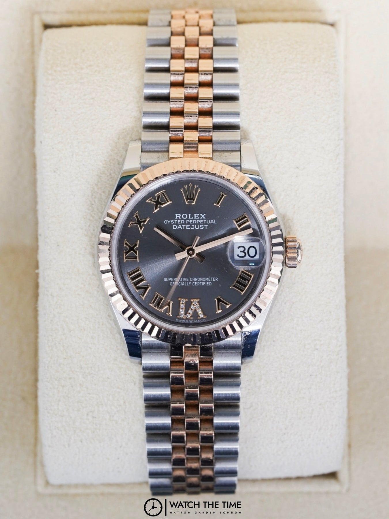 31mm rose gold & stainless steel case, rose gold fluted bezel. Crown set on the right side of the watch as well as the date. Roman rhodium diamond 6 dial, rose gold & stainless steel jubilee bracelet.