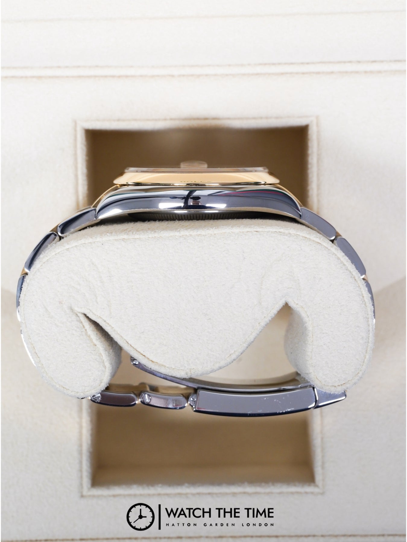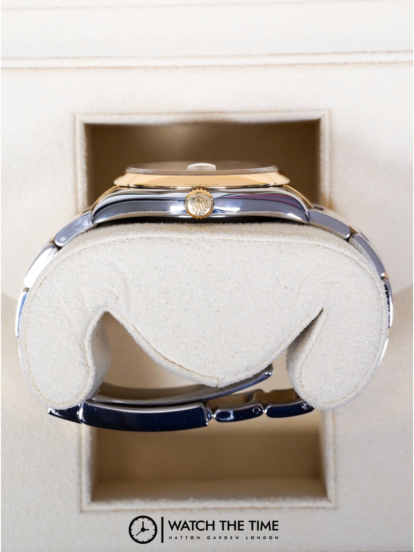 36mm stainless steel case, yellow gold smooth bezel. Crown set on the right side of the watch as well as the date. Champagne jubilee diamond dial, yellow gold & stainless steel oyster bracelet.