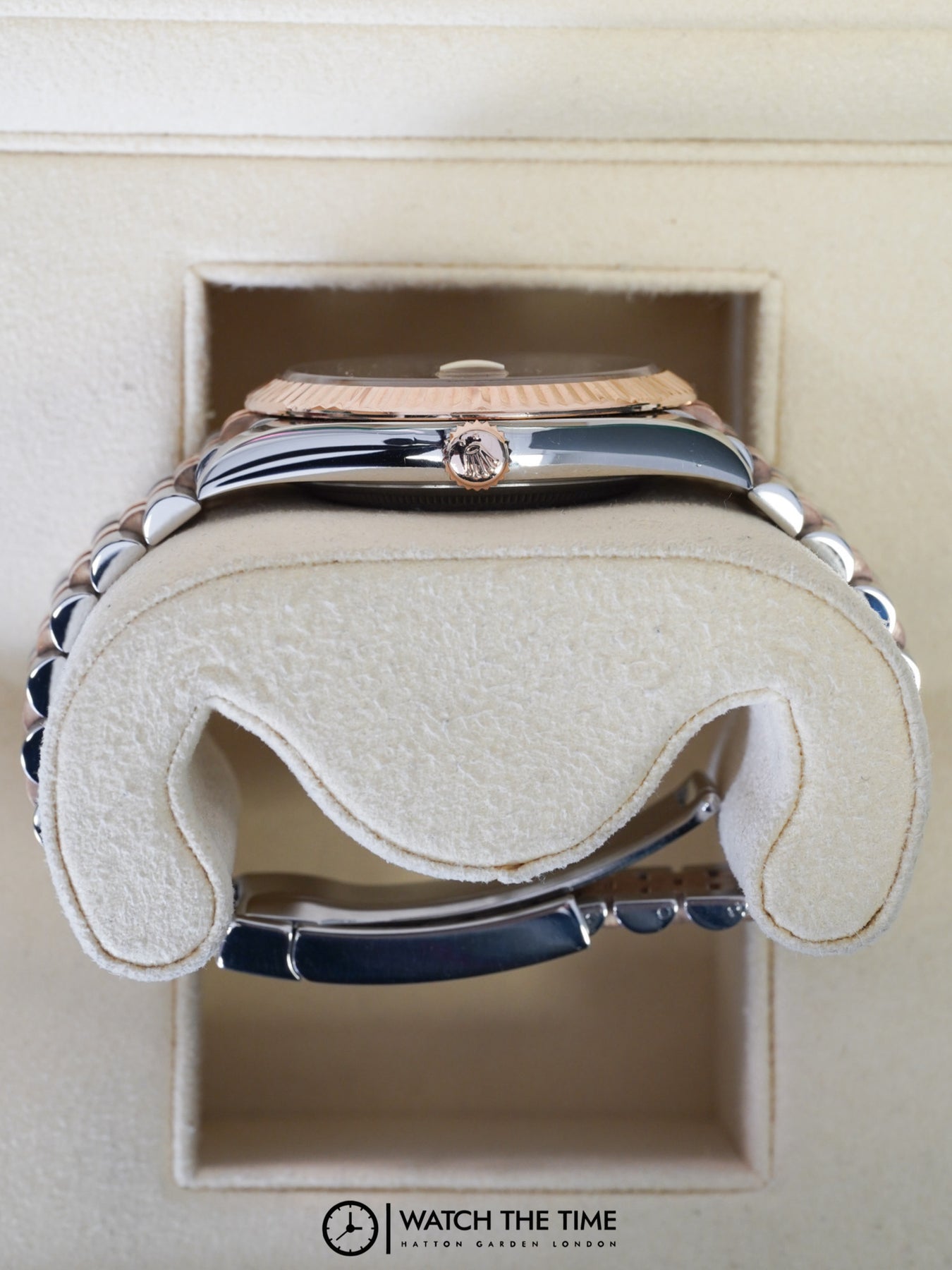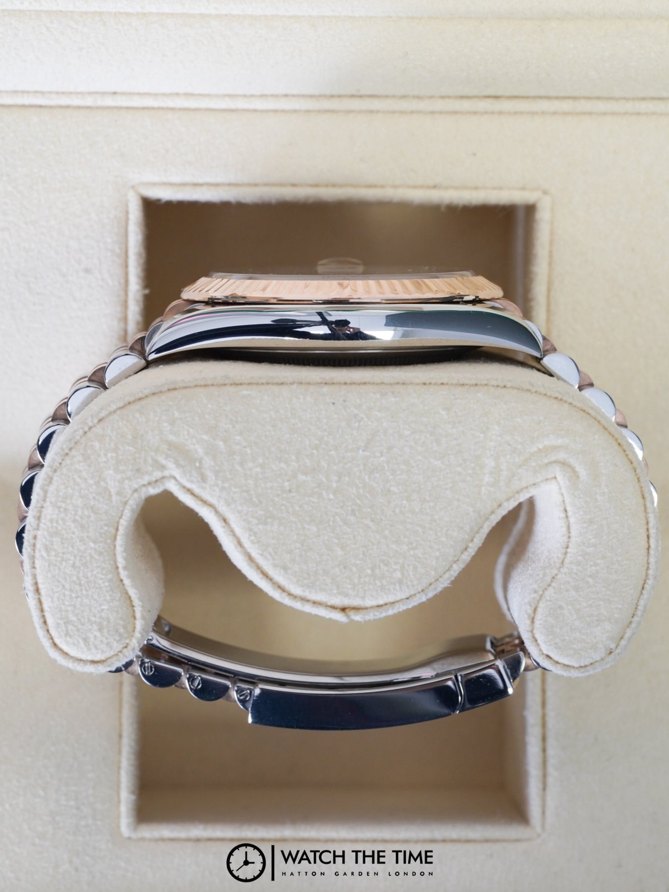 41mm rose gold & stainless steel case, rose gold fluted bezel. Crown set on the right side of the watch as well as the date. Chocolate baton dial, stainless steel & rose gold jubilee bracelet.