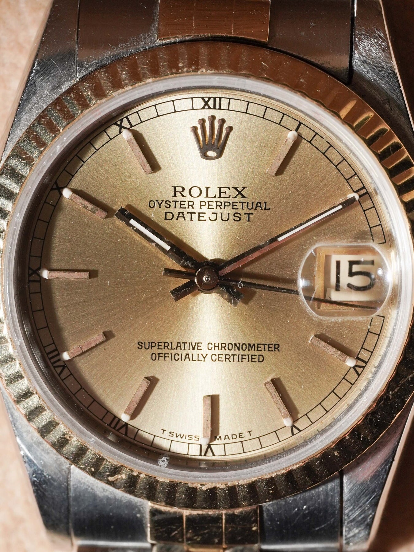 31mm stainless steel & yellow gold case, yellow gold fluted bezel. Crown set on the right side of the watch as well as the date. Champagne dial, stainless steel & yellow gold jubilee bracelet.