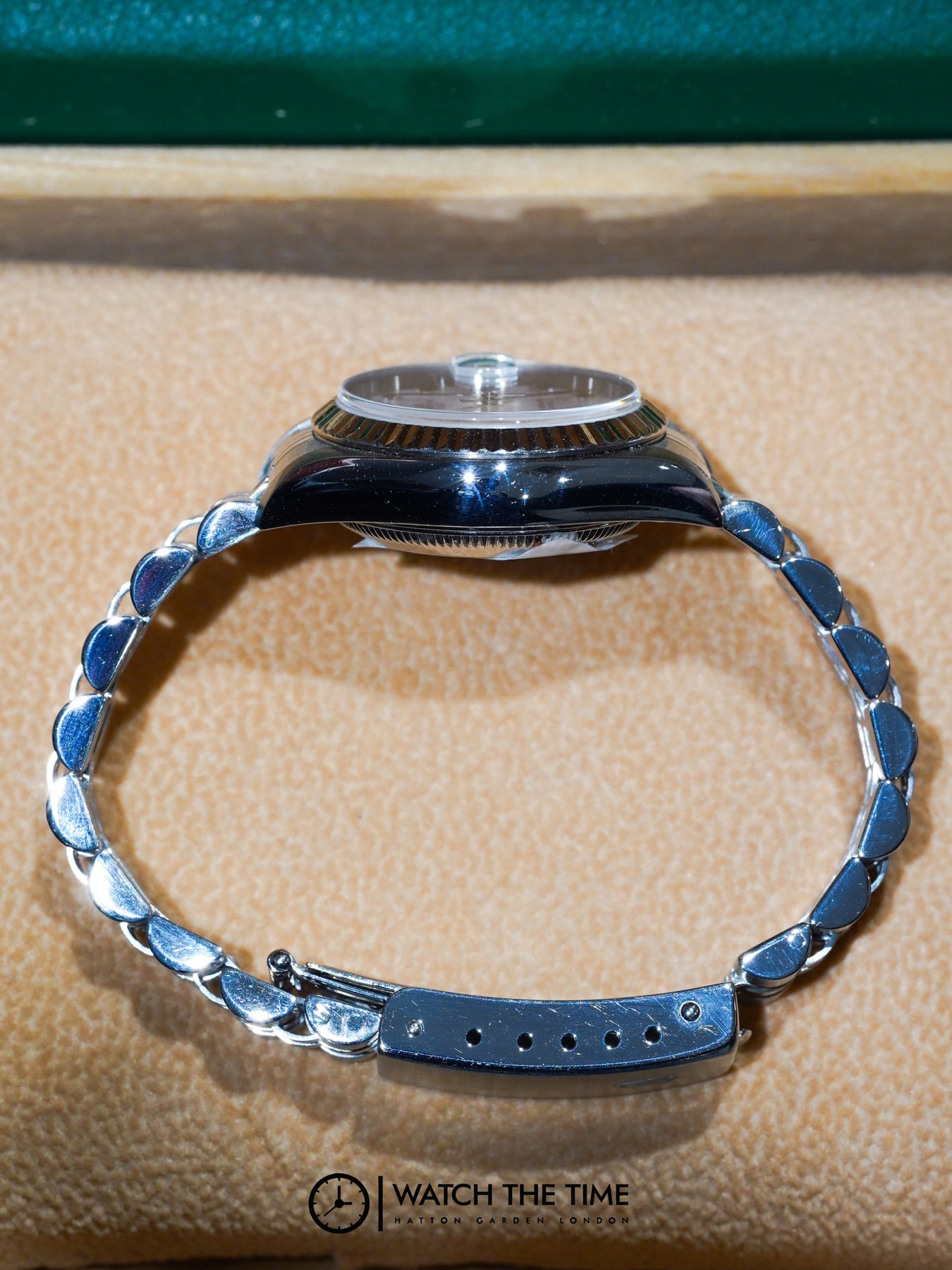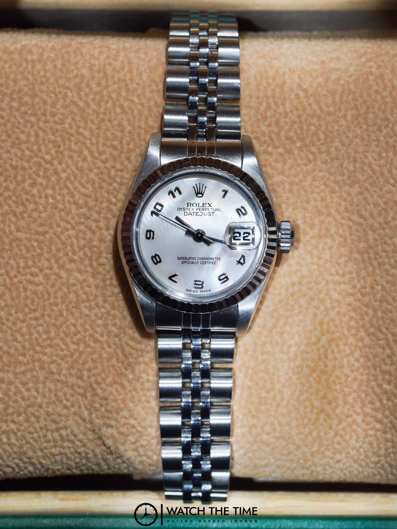 26mm Stainless Steel Case, Fluted Bezel, Crown Set On The Right Side As Well As The Date. Independent 12 hour Hand, Mother Of Pearl Dial, Stainless Steel Jubilee Bracelet.