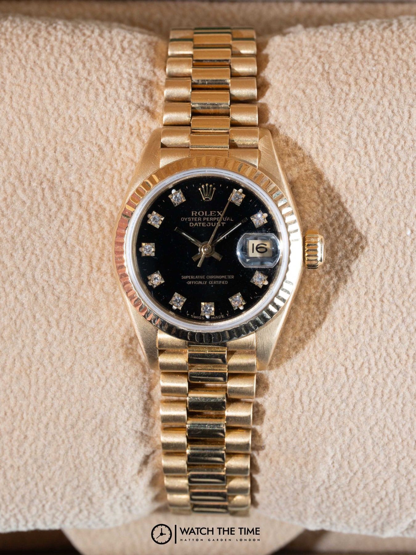 26mm yellow gold case, yellow gold fluted bezel. Crown set on the right side of the watch as well as the date. Black diamond dial, yellow gold presidential bracelet.