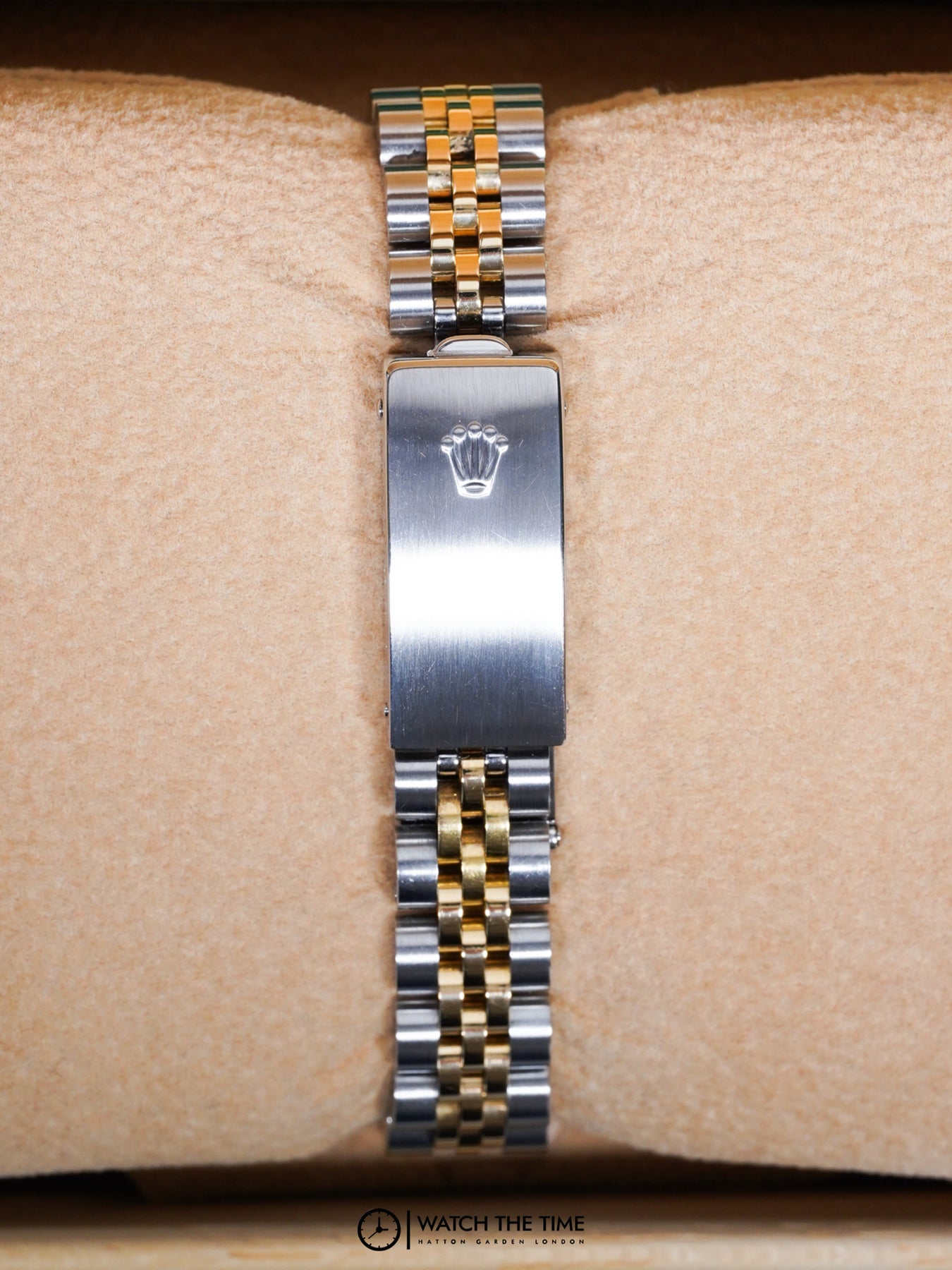26mm stainless steel & yellow gold case, yellow gold fluted bezel. Crown set on the right side of the watch as well as the date. Custom rhodium diamond dial, stainless steel & yellow gold jubilee bracelet.