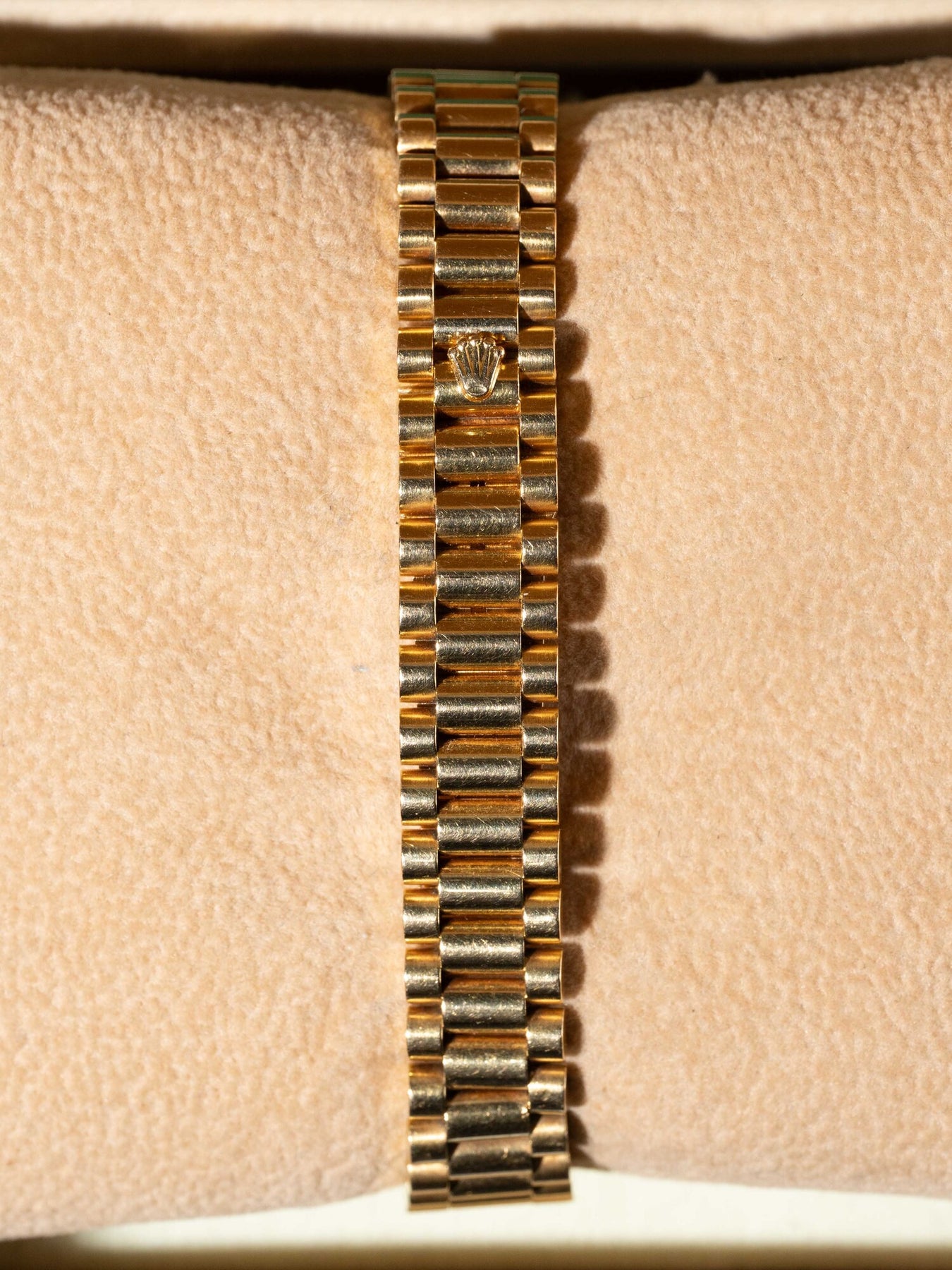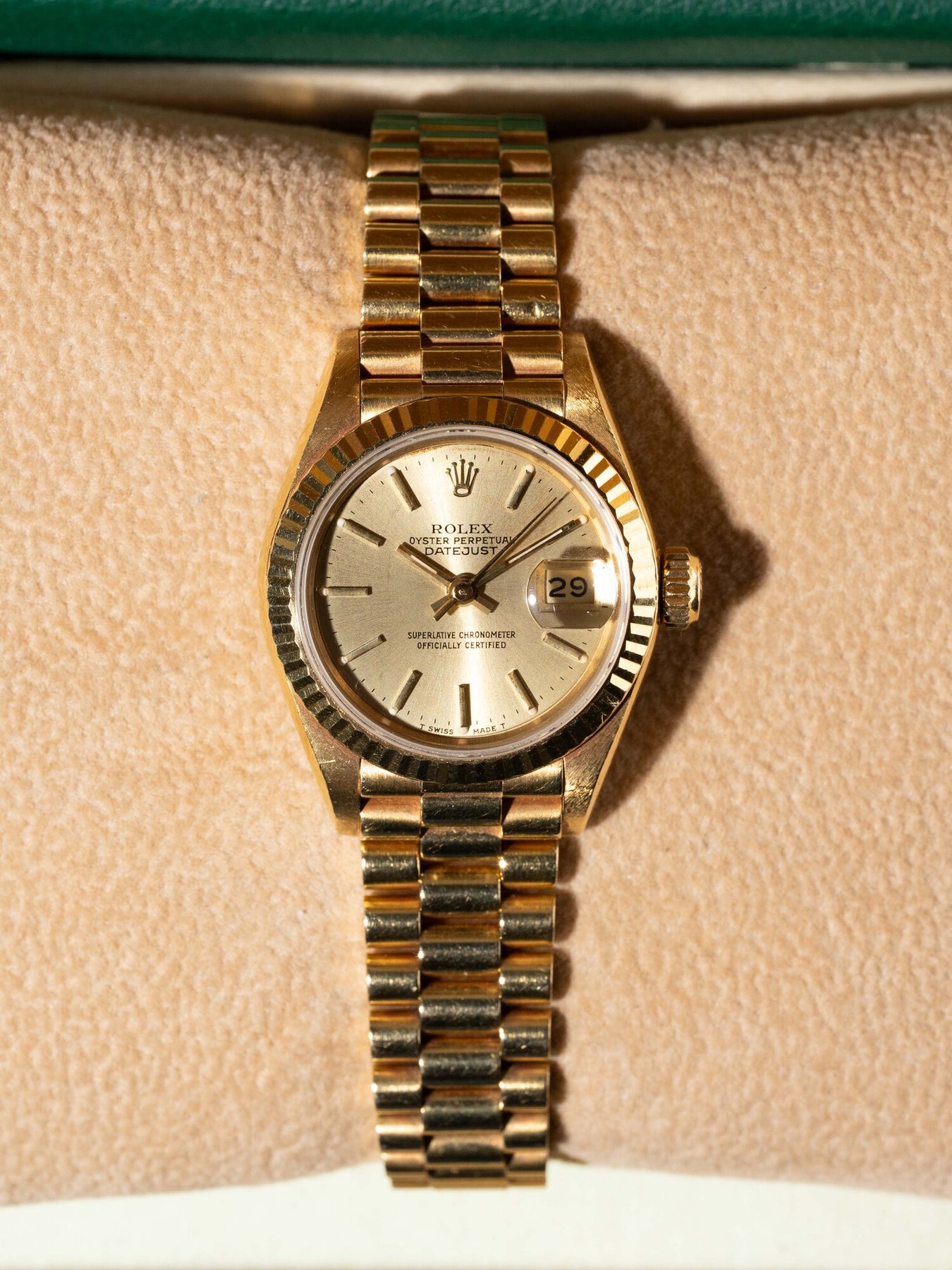 26mm yellow gold case, yellow gold fluted bezel. Crown set on the right side of the watch as well as the date. Champagne dial, yellow gold presidential bracelet.