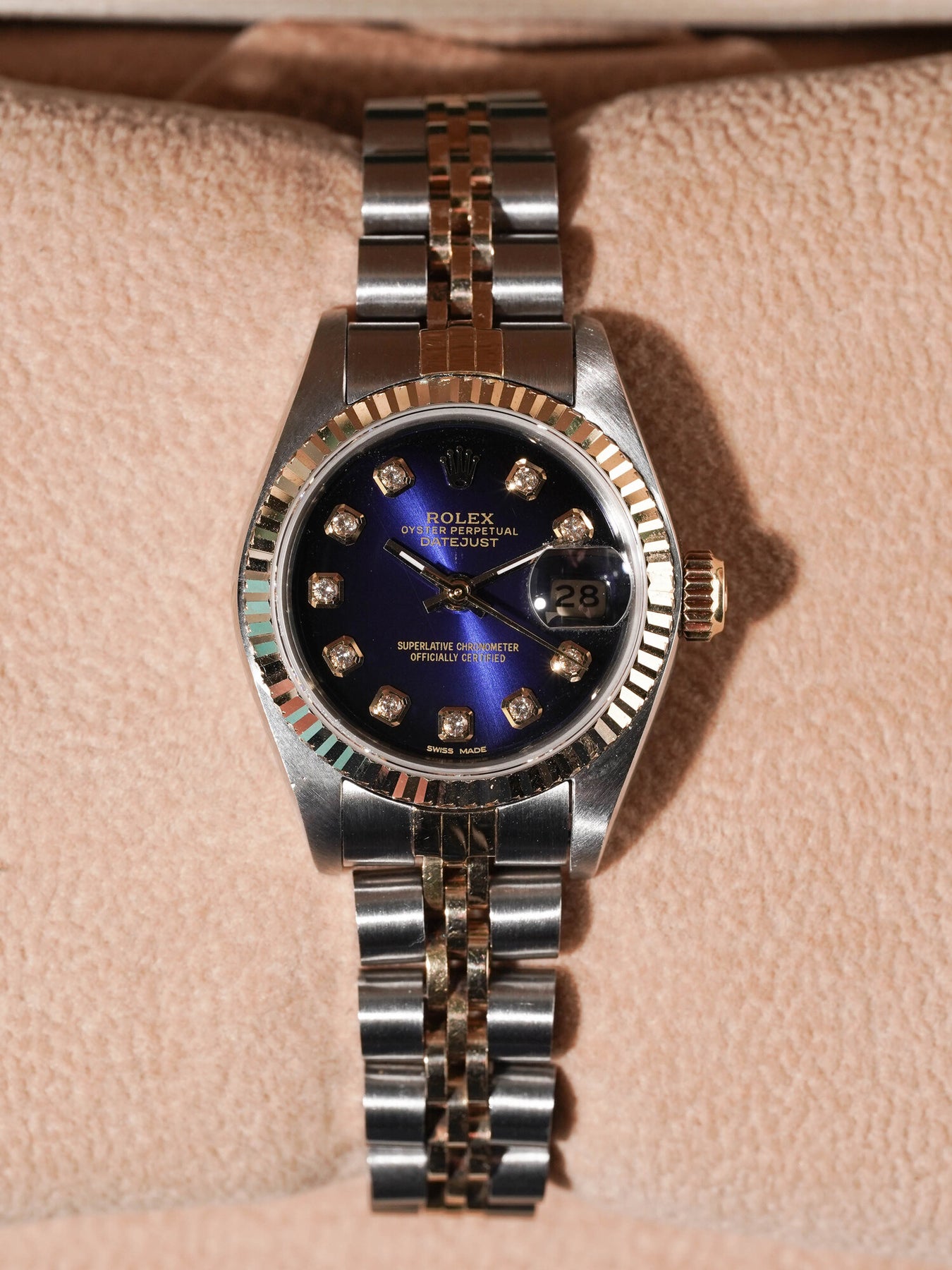 26mm stainless steel & yellow gold case, yellow gold fluted bezel. Crown set on the right side of the watch as well as the date. Custom blue diamond dial, stainless steel & yellow gold jubilee bracelet.