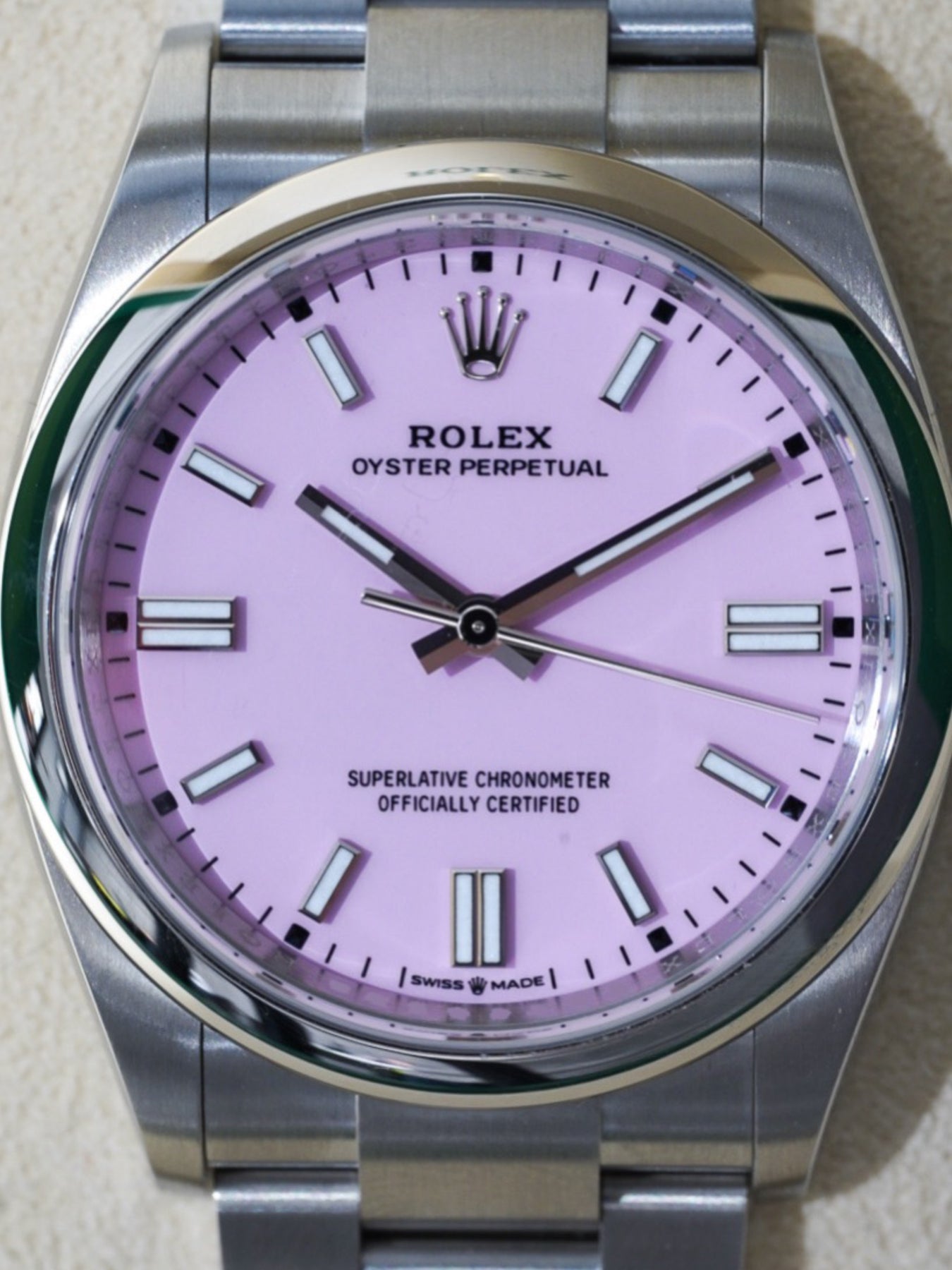 36mm Stainless Steel Case, Smooth Bezel, Crown Set On The Right Side Of The Watch. Candy Pink Dial, Stainless Steel Oyster Bracelet.