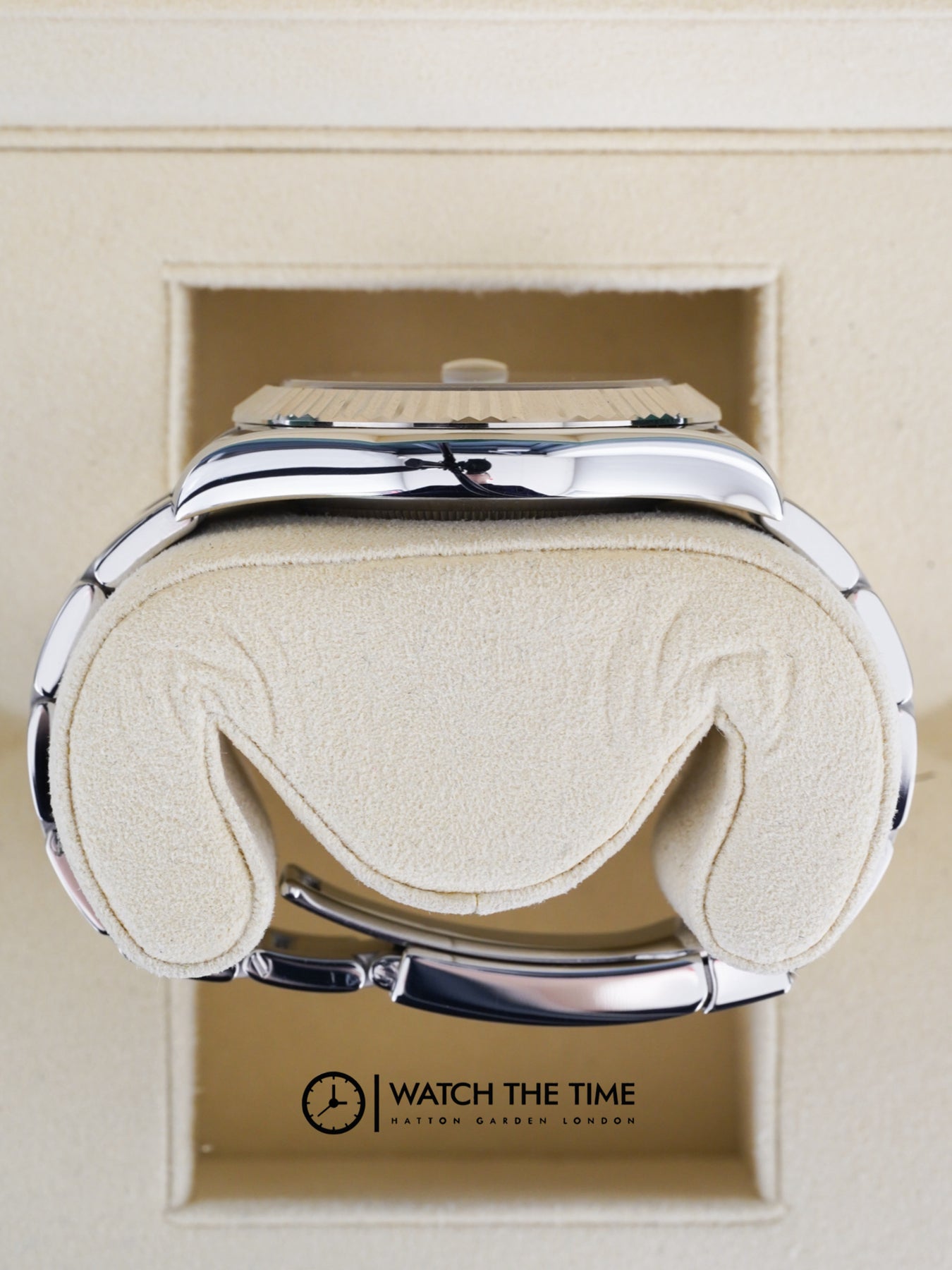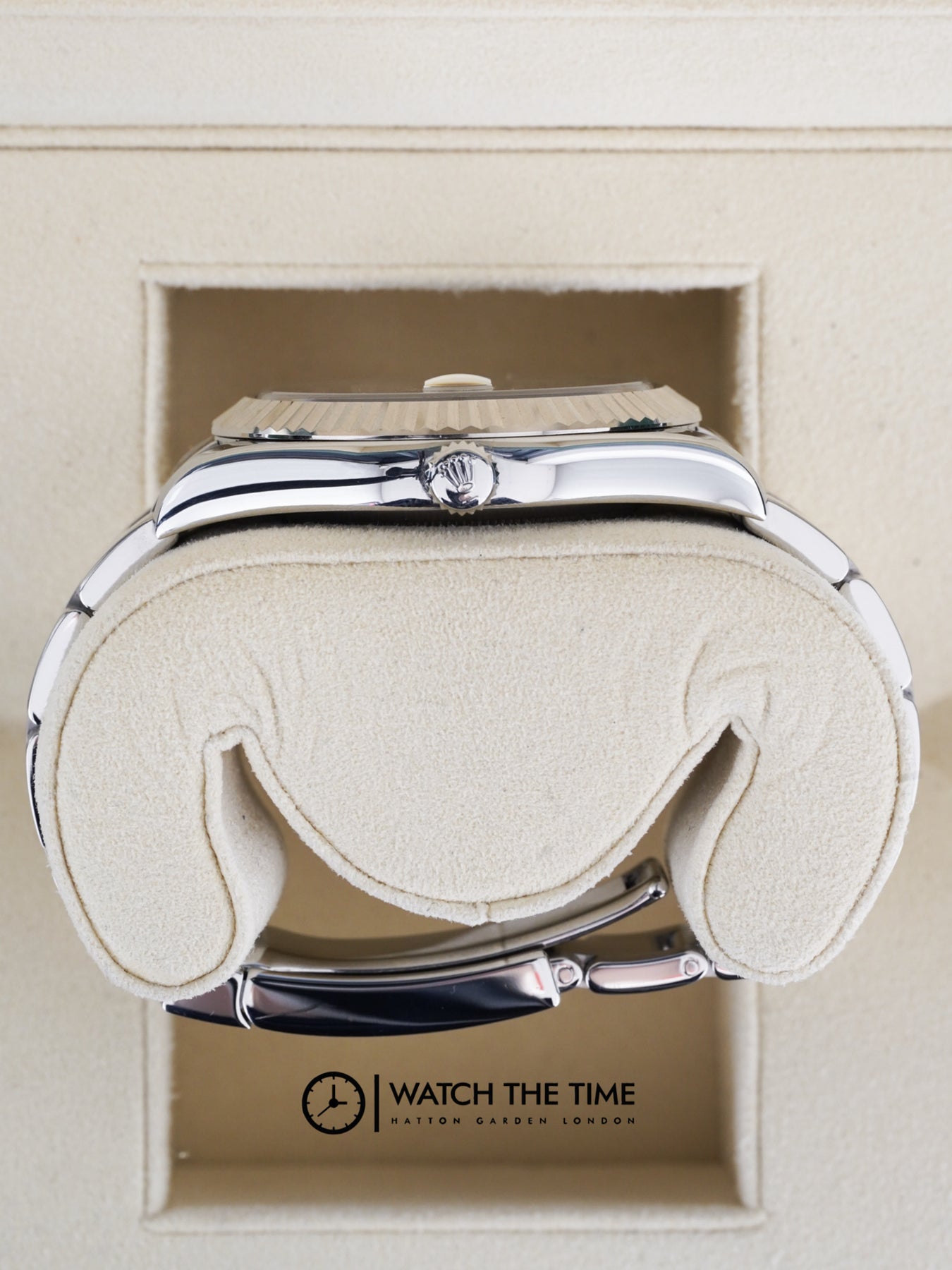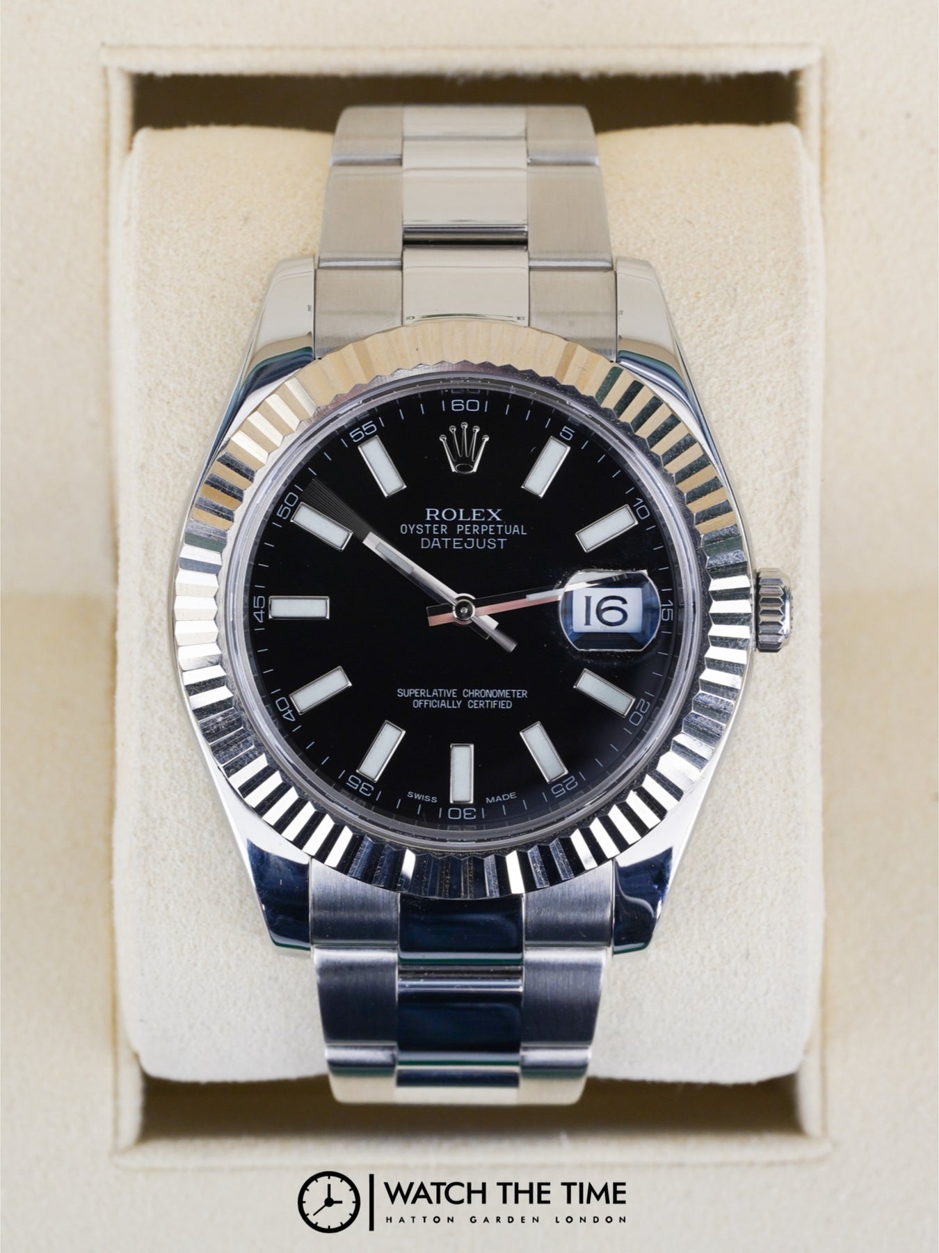 41mm stainless steel case, white gold fluted bezel. Crown set on the right side of the watch as well as the date. Black dial, stainless steel oyster bracelet.