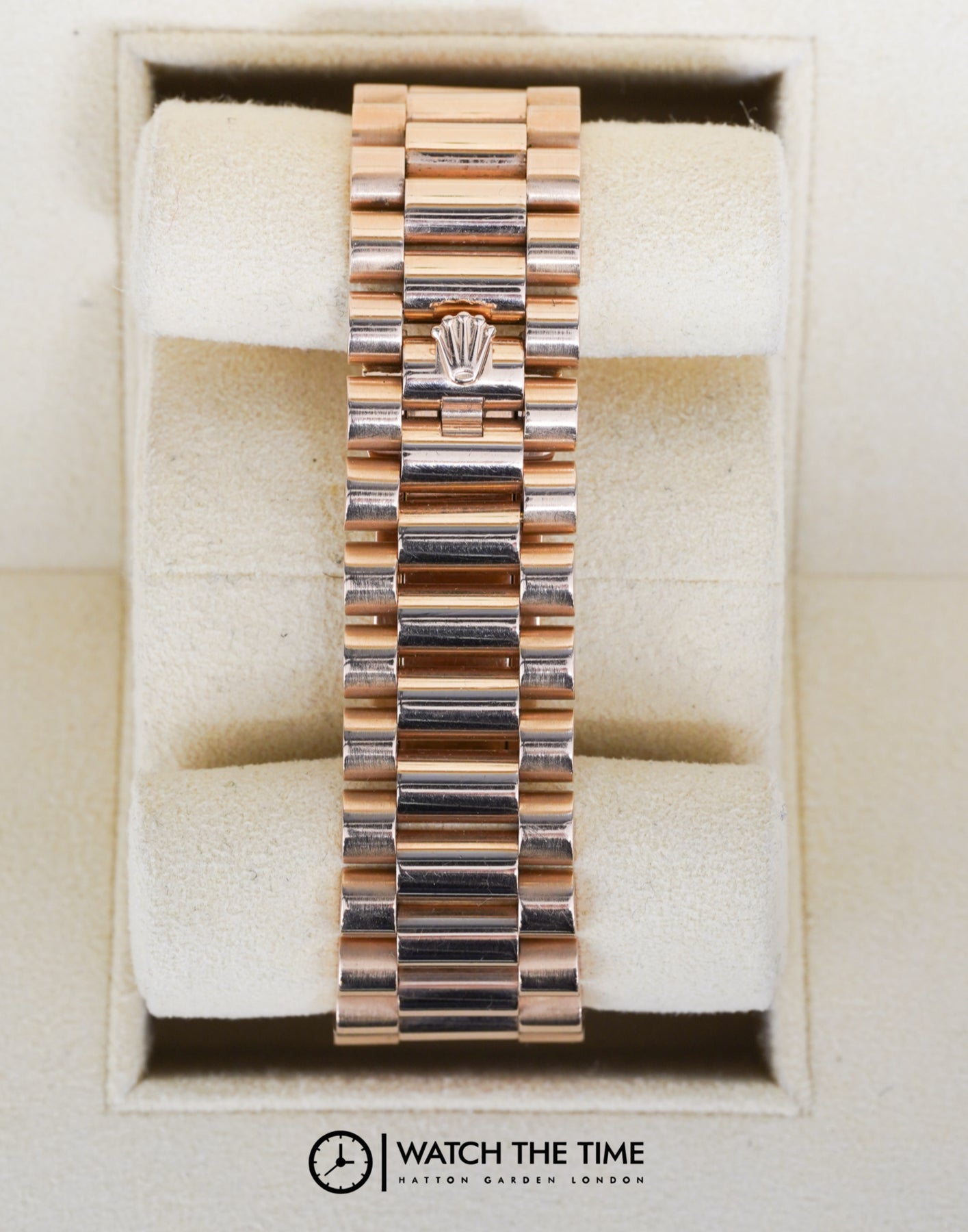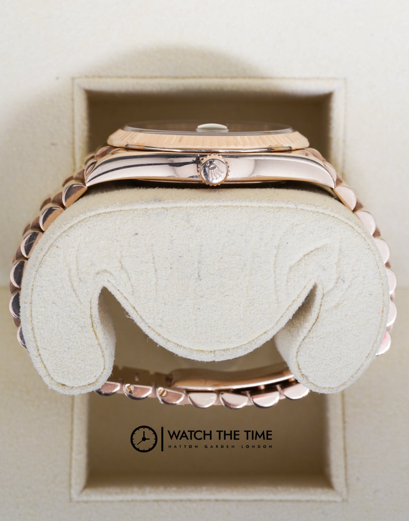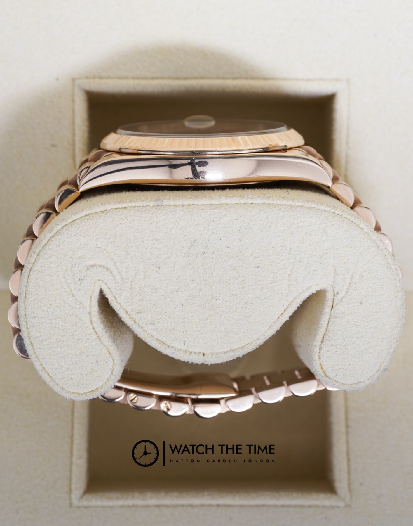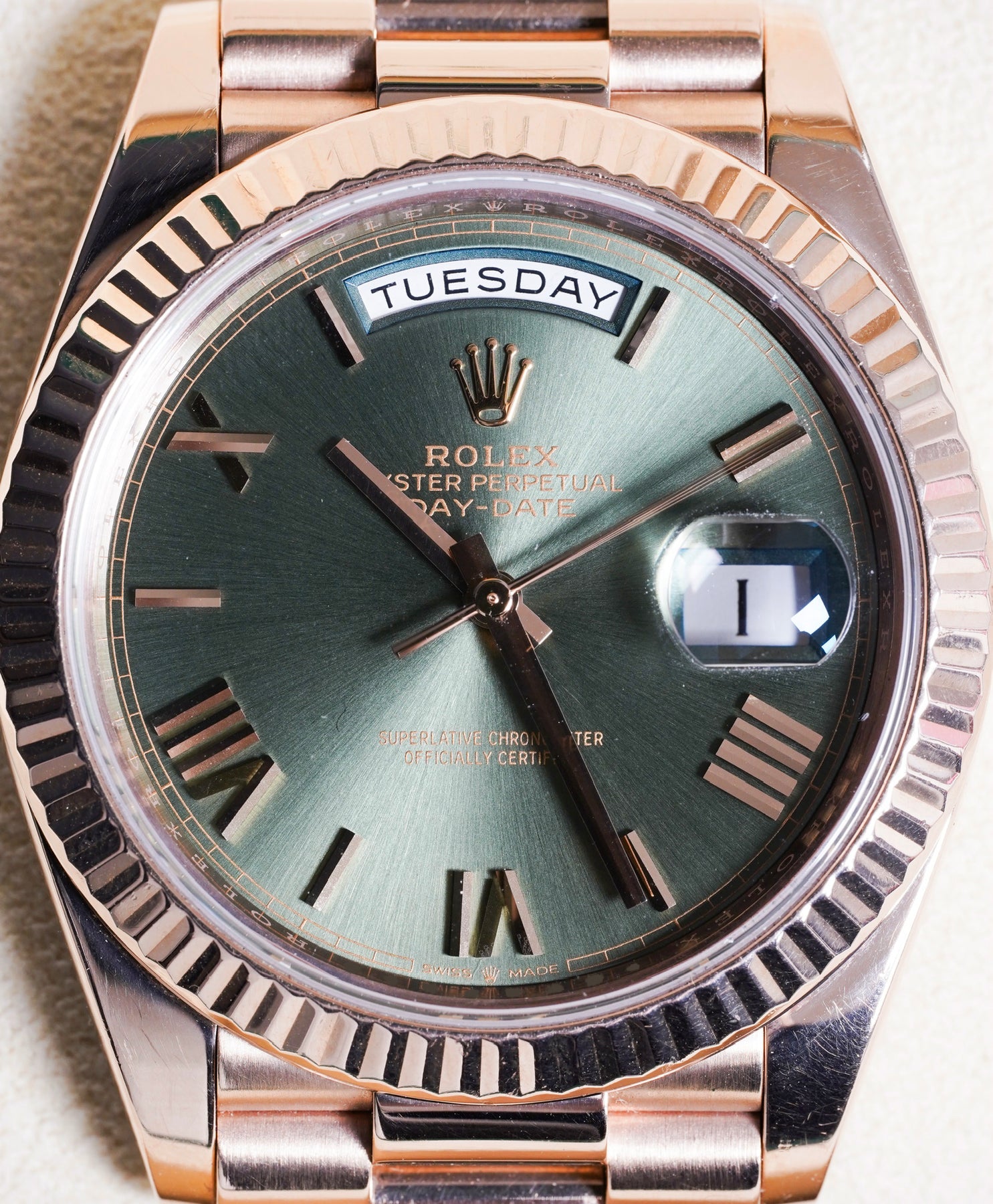 40mm rose gold case, rose gold fluted bezel. Crown set on the right side of the watch as well as the date. Green olive dial, rose gold presidential bracelet.