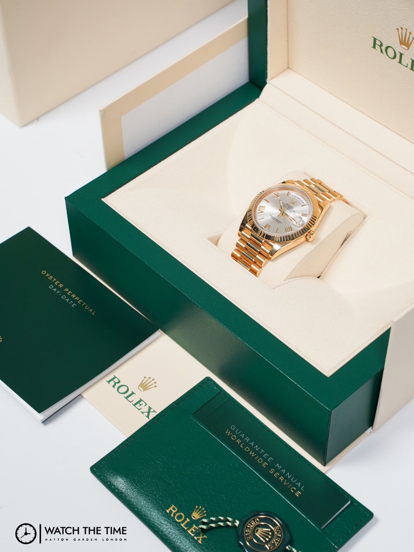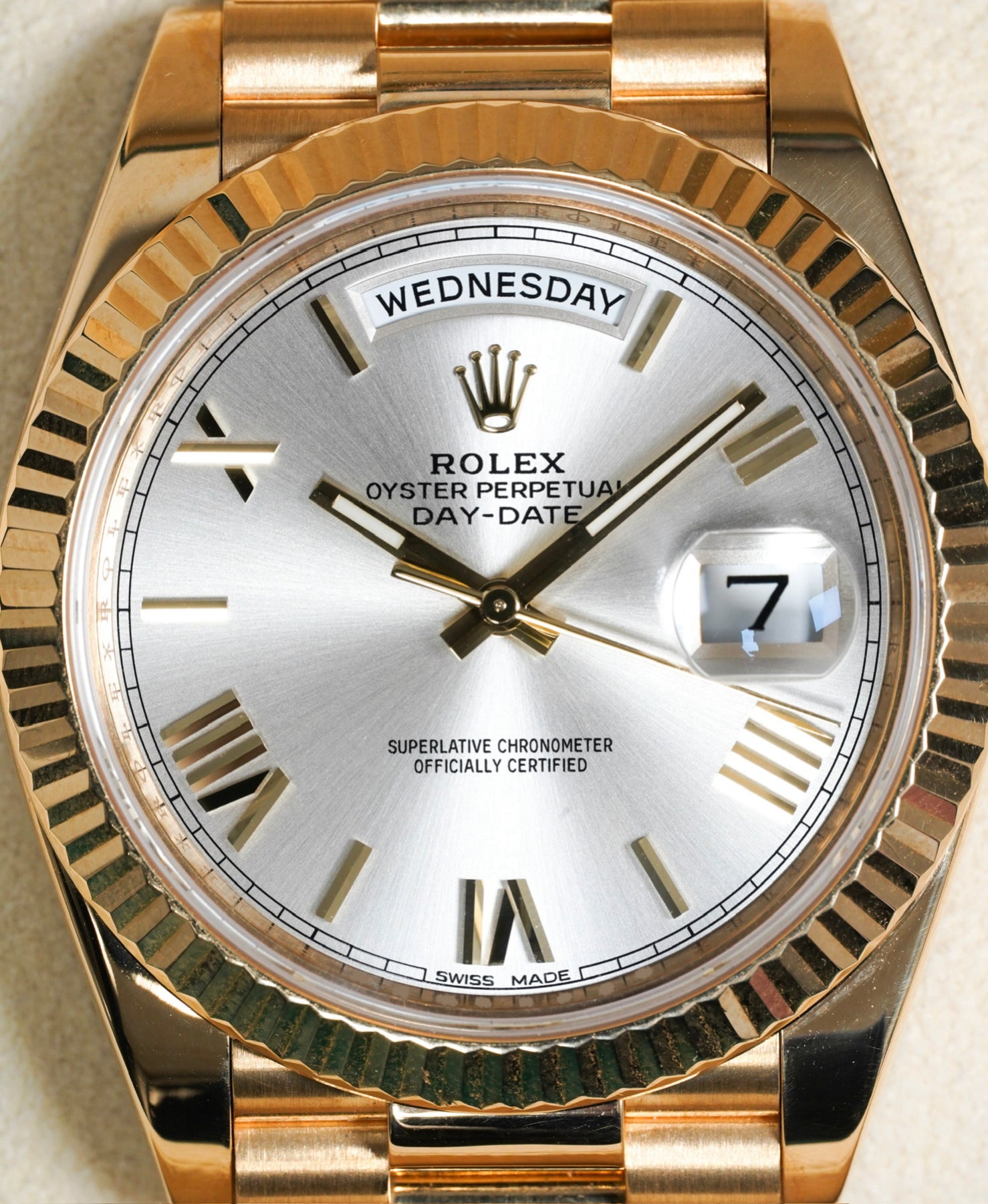 40mm yellow gold case, yellow gold fluted bezel. Crown set on the right side of the watch as well as the date. Silver roman dial, yellow gold presidential bracelet.