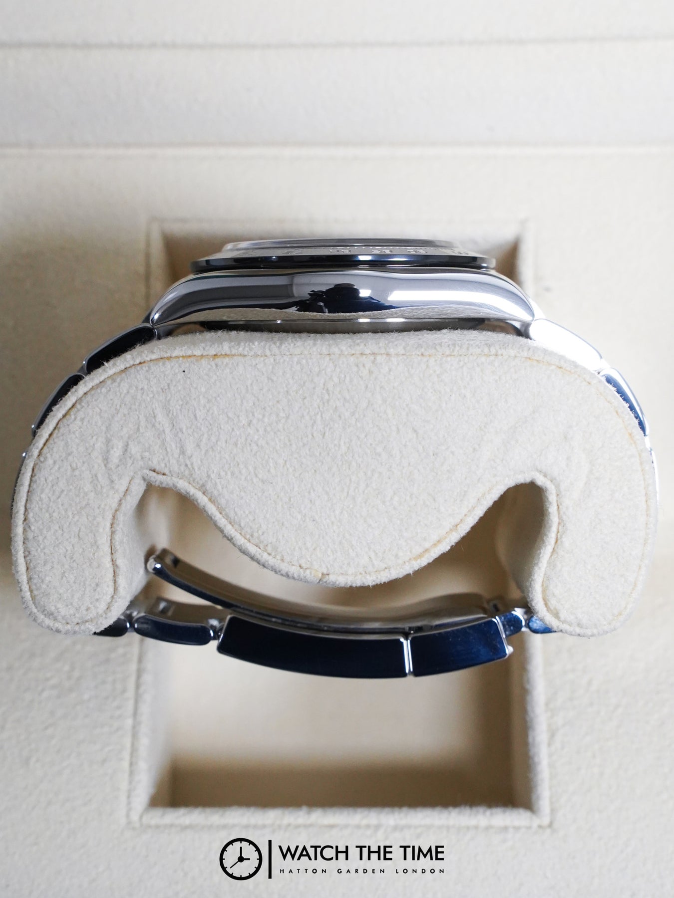 40mm stainless steel case, black ceramic bezel. Crown set on the right side of the watch. Black dial, stainless steel oyster bracelet.