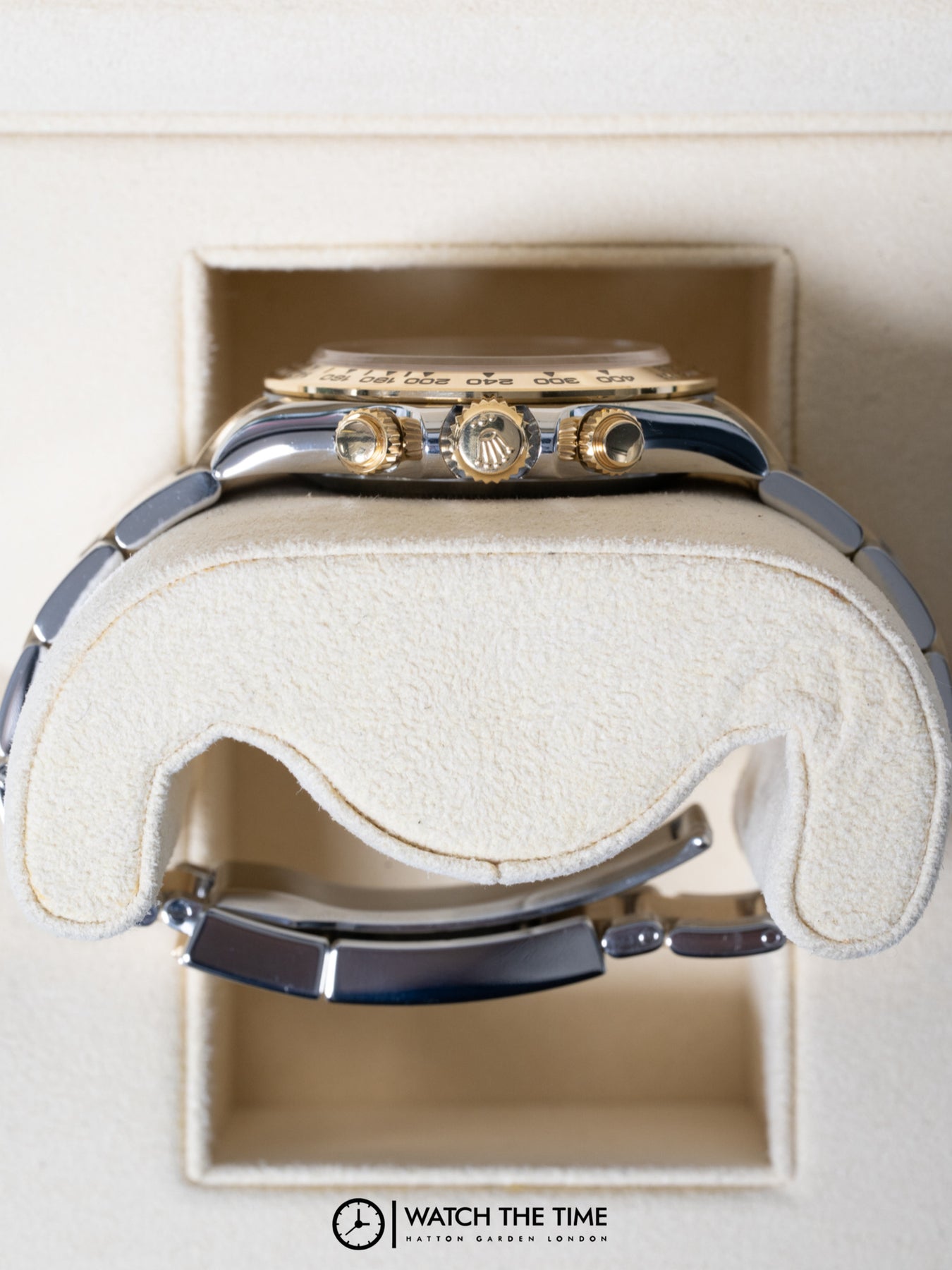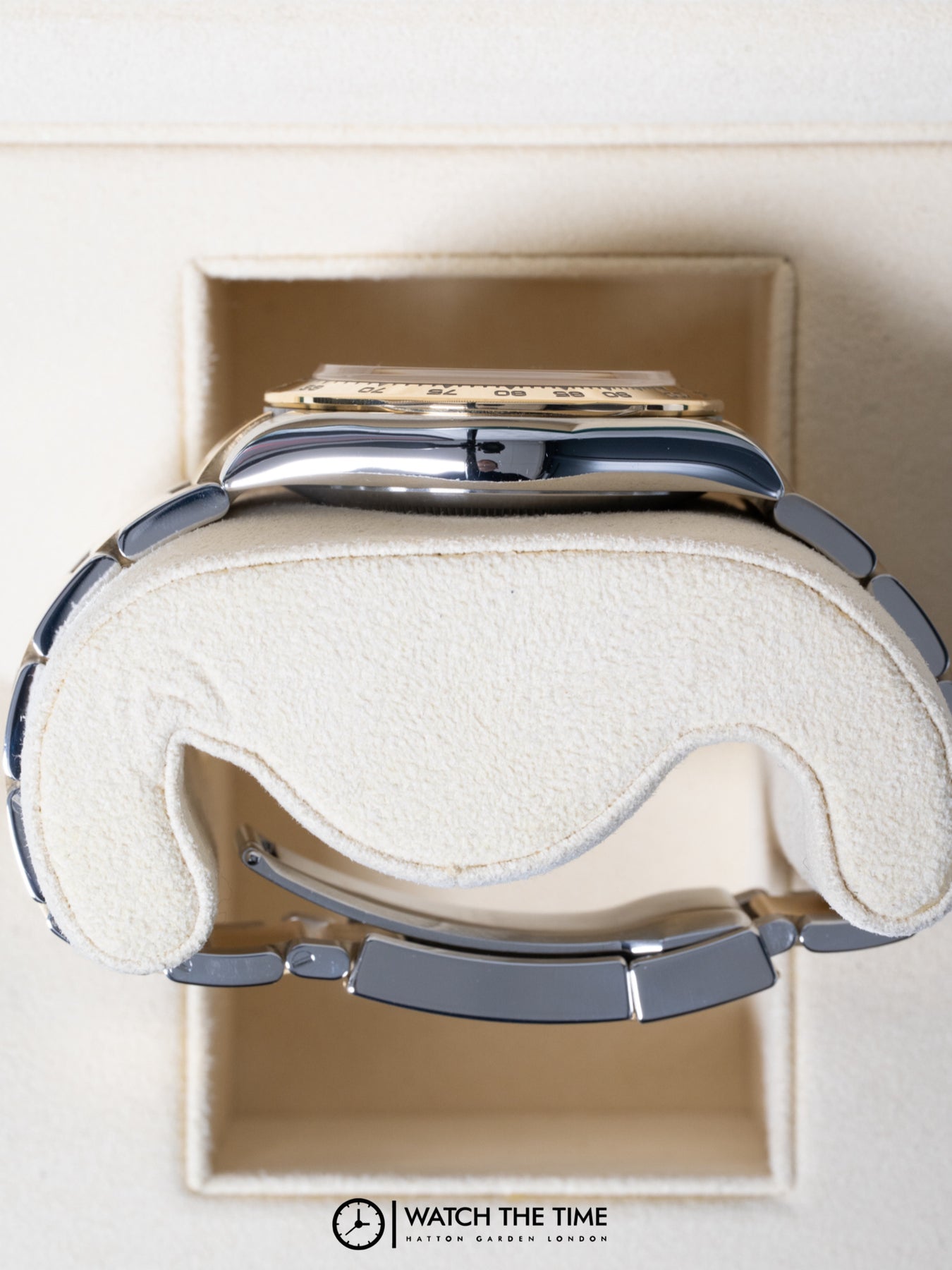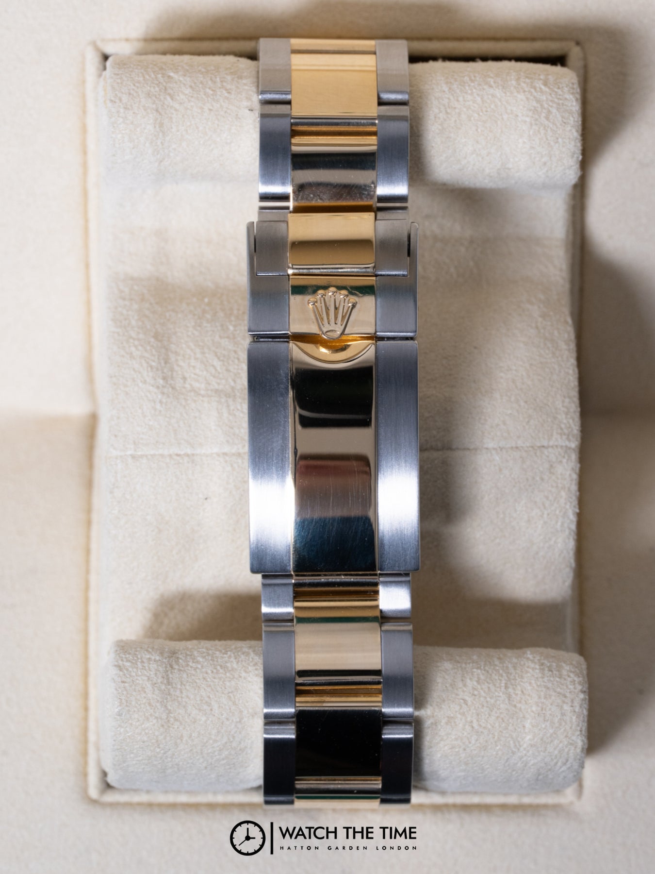 40mm stainless steel & yellow gold case, yellow gold bezel. Crown set on the right side of the watch. Champagne diamond dial, stainless steel & yellow gold oyster bracelet.