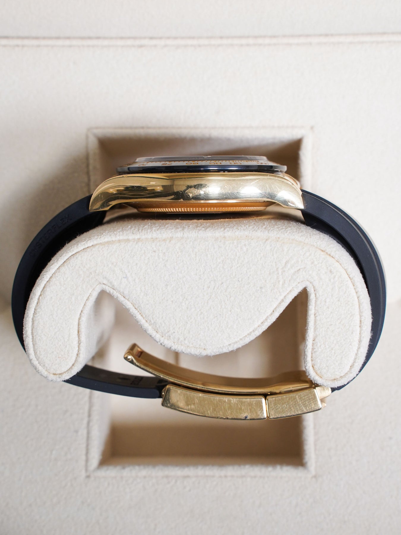 40mm yellow gold case, black ceramic bezel. Crown set on the right side of the watch. Pikachu dial, oysterflex strap.