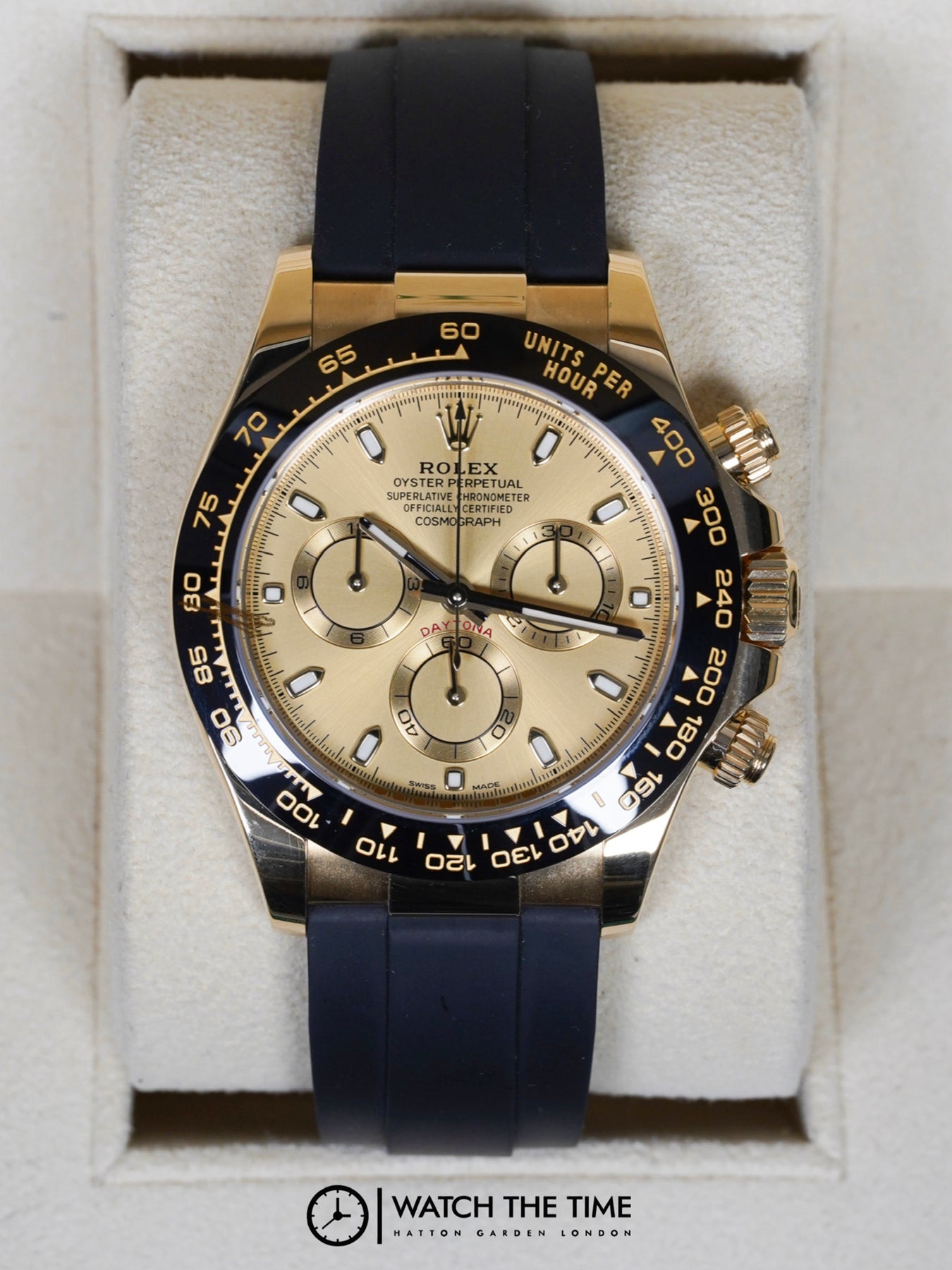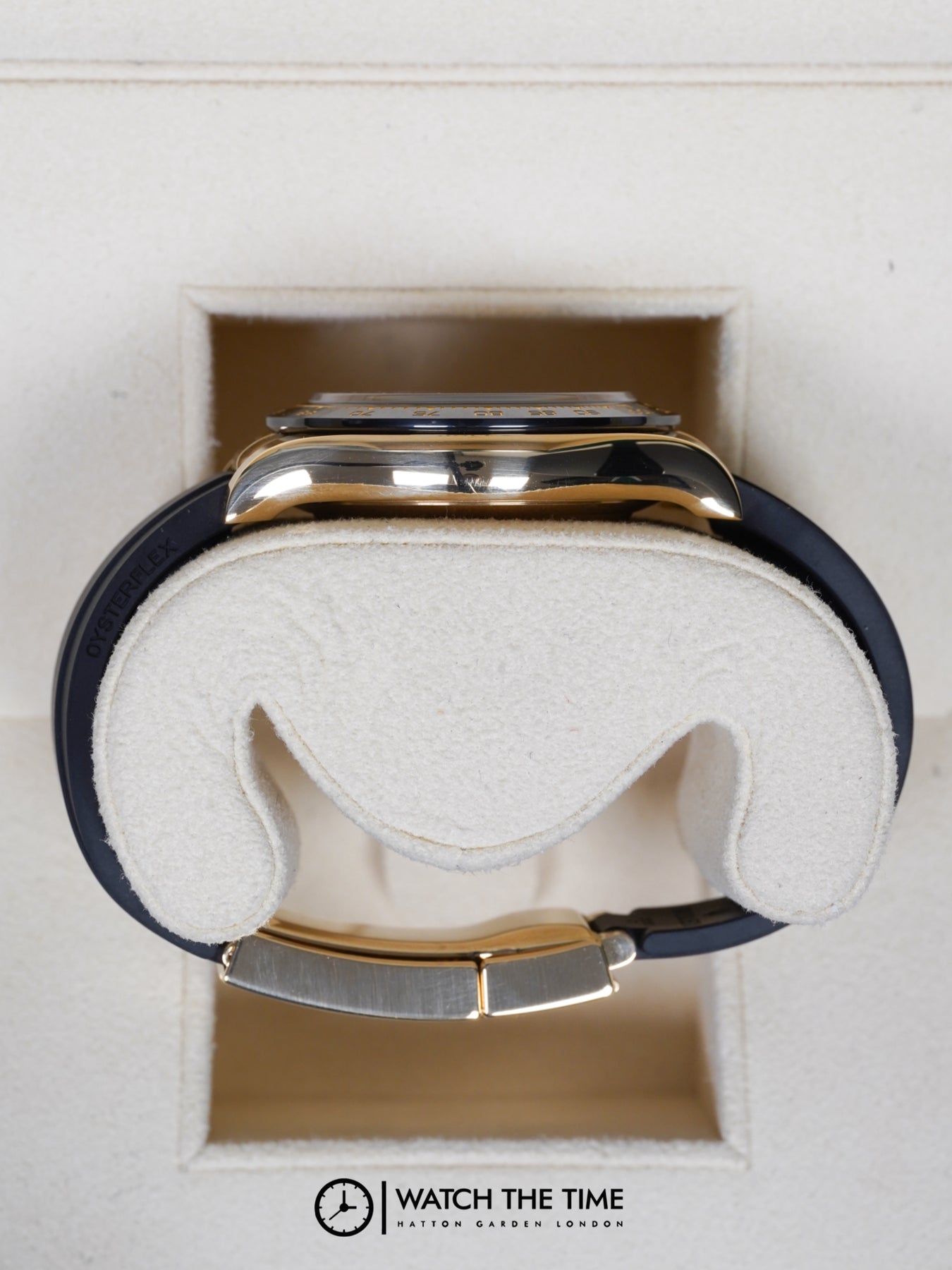 40mm yellow gold case, black ceramic bezel. Crown set on the right side of the watch. Champagne dial, rubber oysterflex bracelet.