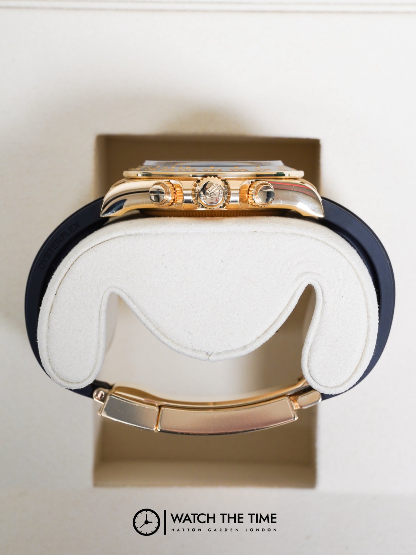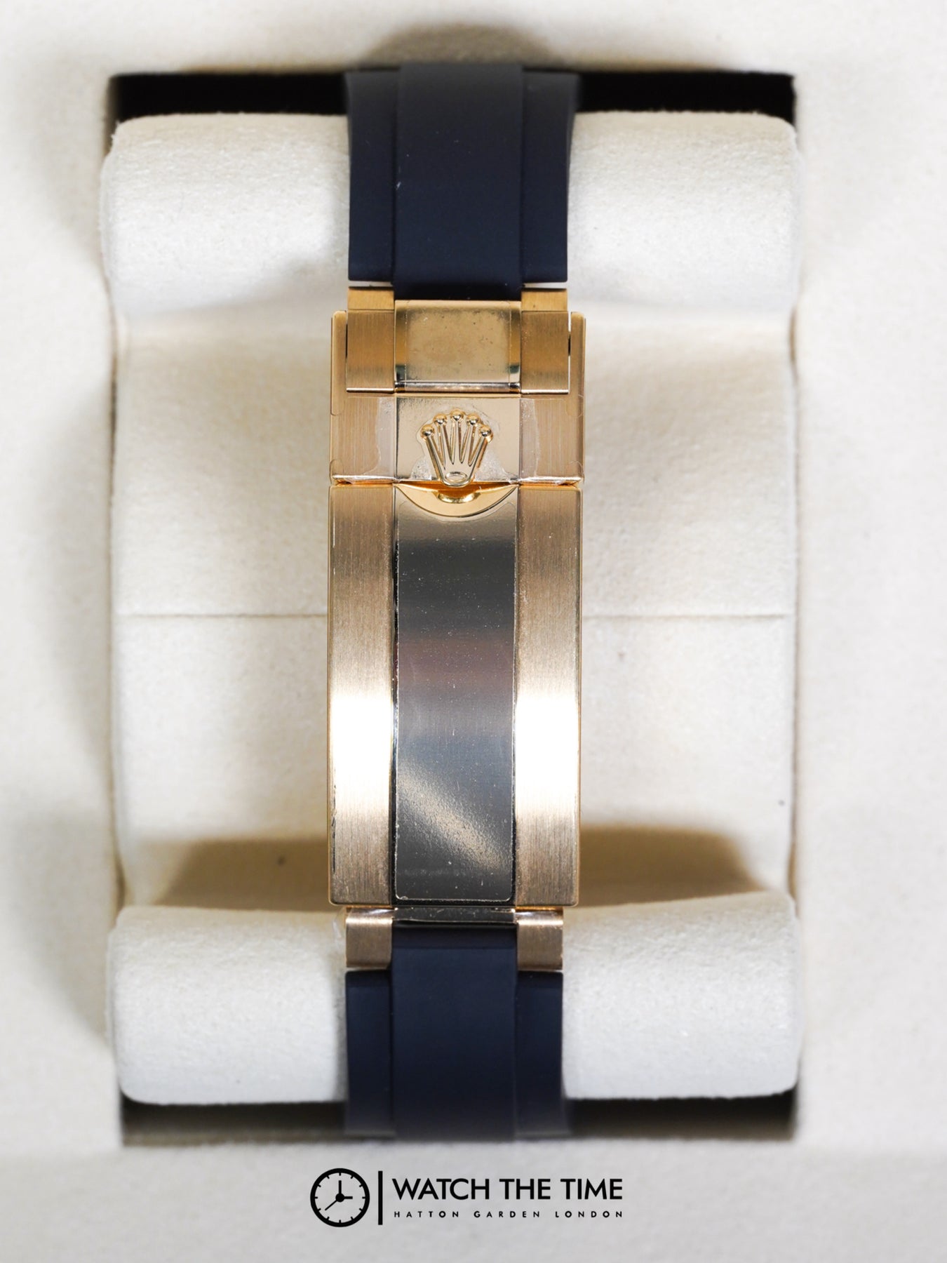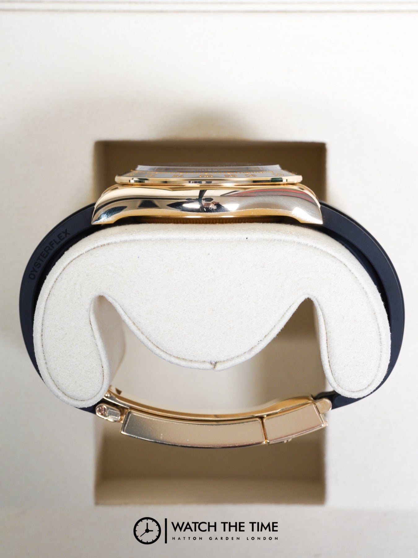 40mm yellow gold case, crown set on the right side of the watch. Blue Tiffany dial, rubber oysterflex bracelet.