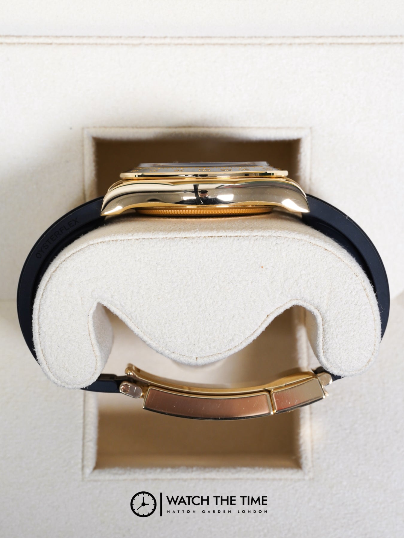 40mm yellow gold case. Crown set on the right side of the watch, black dial, rubber oysterflex strap.