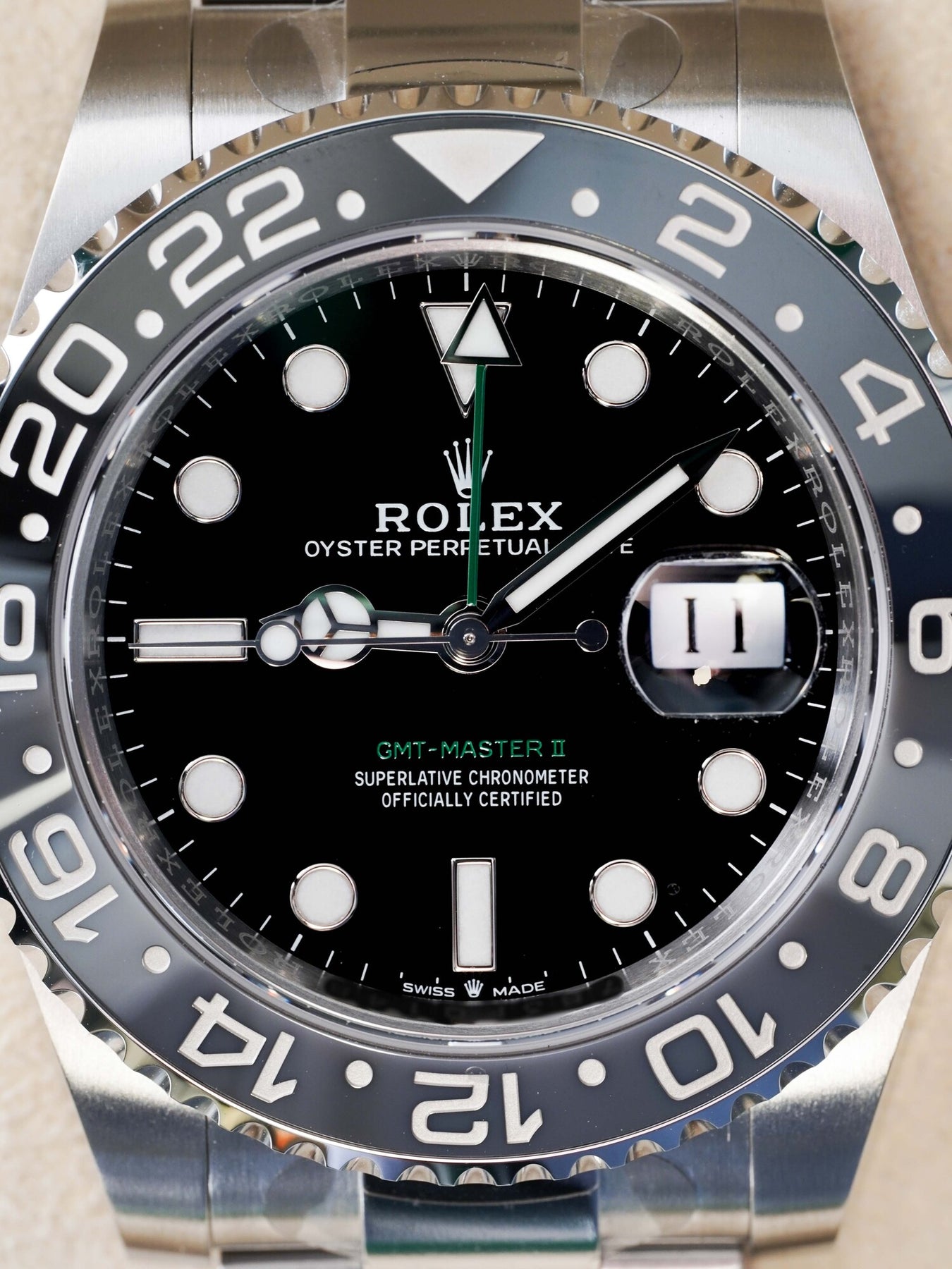 40mm stainless steel case, black & grey ceramic bezel. Crown set on the right side of the watch as well as the date. Black dial, stainless steel oyster bracelet.