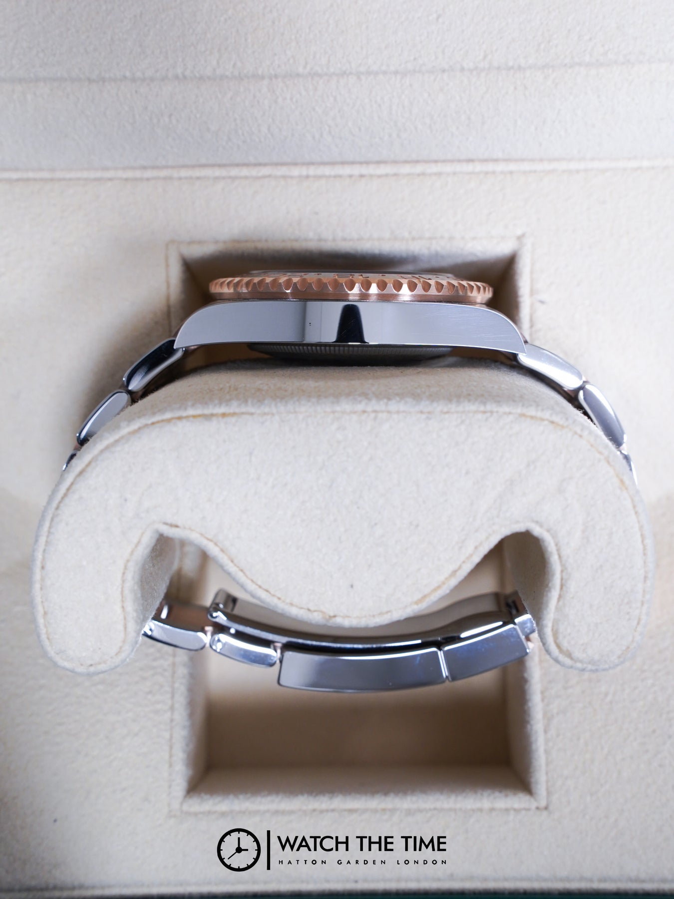 40mm Stainless Steel & Rose Gold Case, Ceramic Bezel, Crown Set On The Right Side Of The Watch As Well As The Date. Black Dial, Stainless Steel & Rose Gold Oyster Bracelet.
