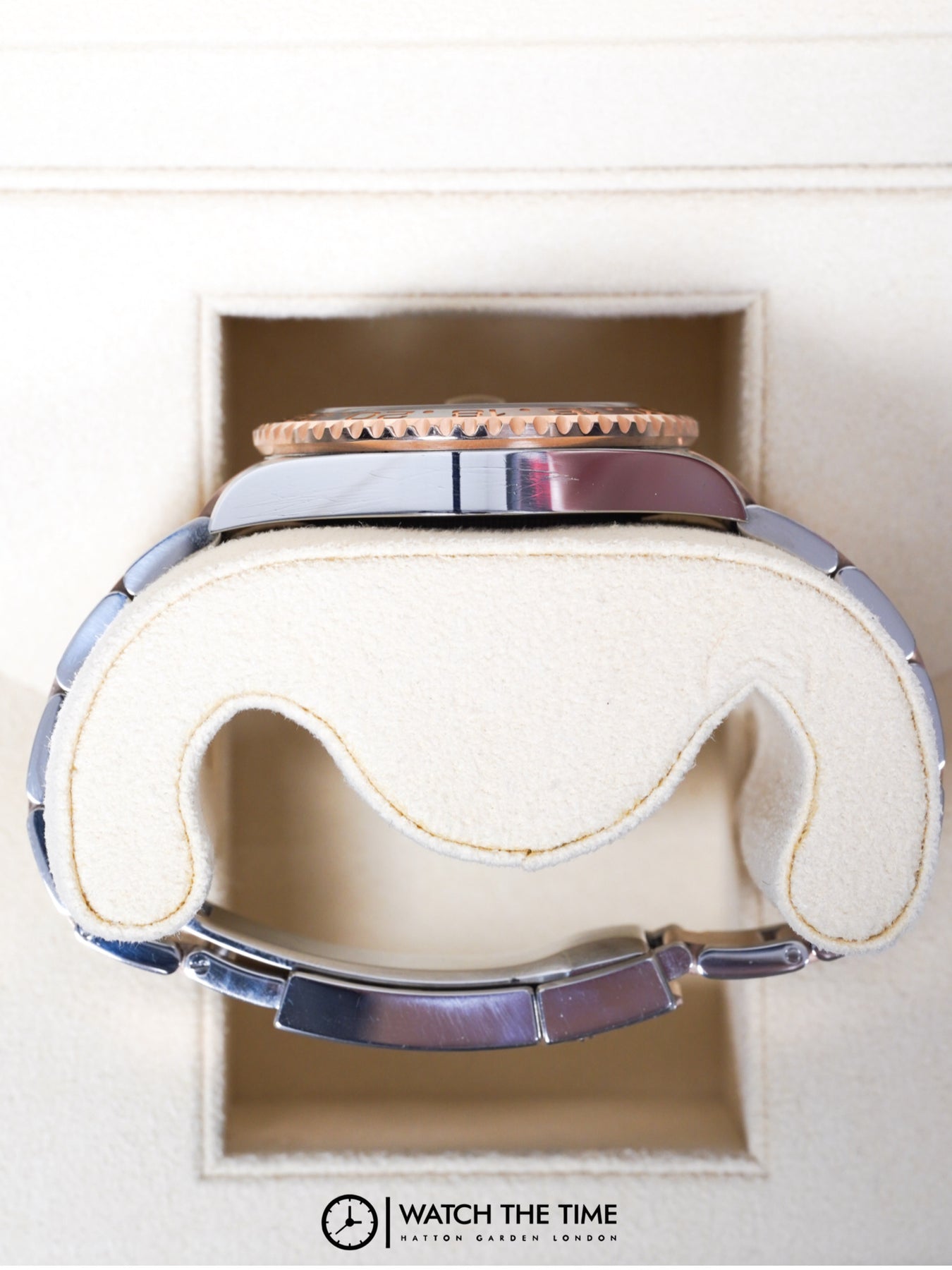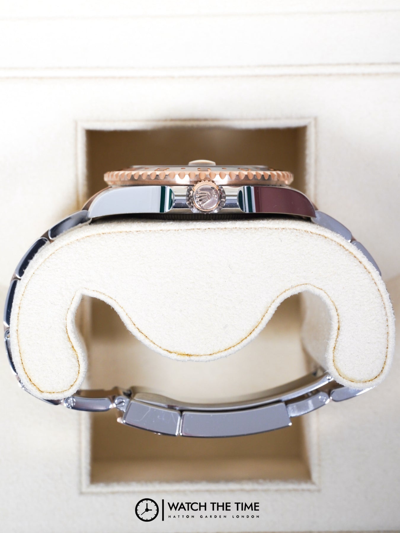 40mm stainless steel case. Crown set on the right side of the watch as well as the date. Black dial, rose gold and stainless steel oyster bracelet.