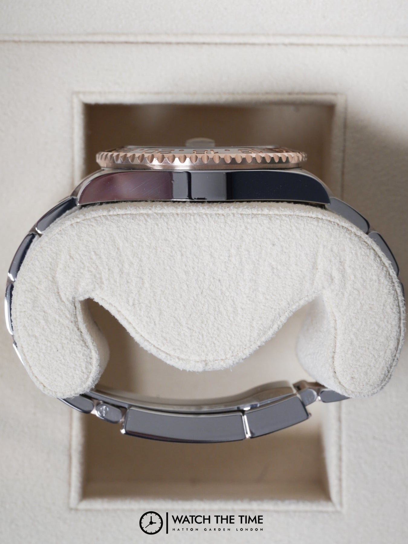 40mm stainless steel & rose gold case, ceramic bezel. Crown set on the right side of the watch as well as the date. Black dial, stainless steel & rose gold oyster bracelet.