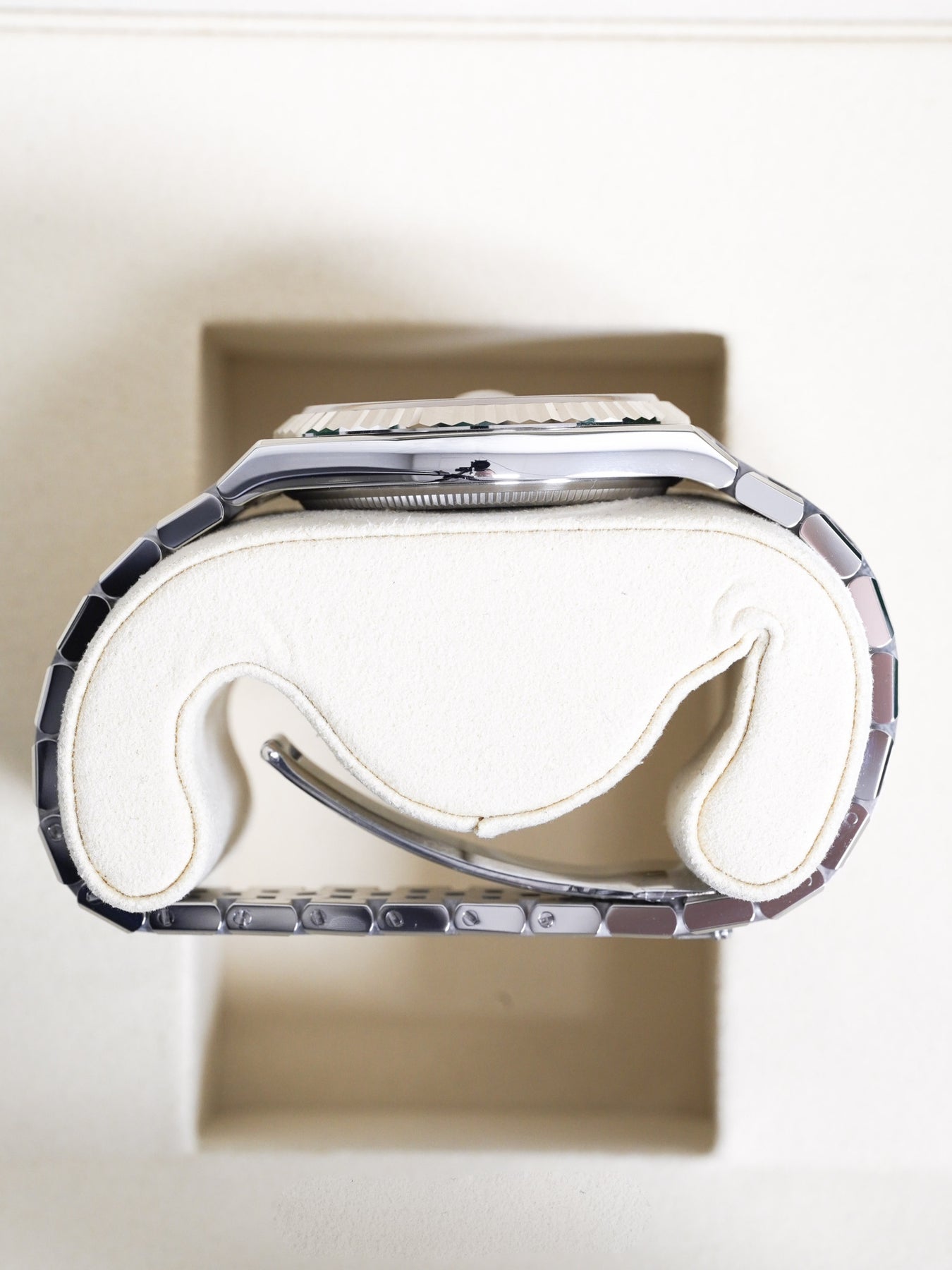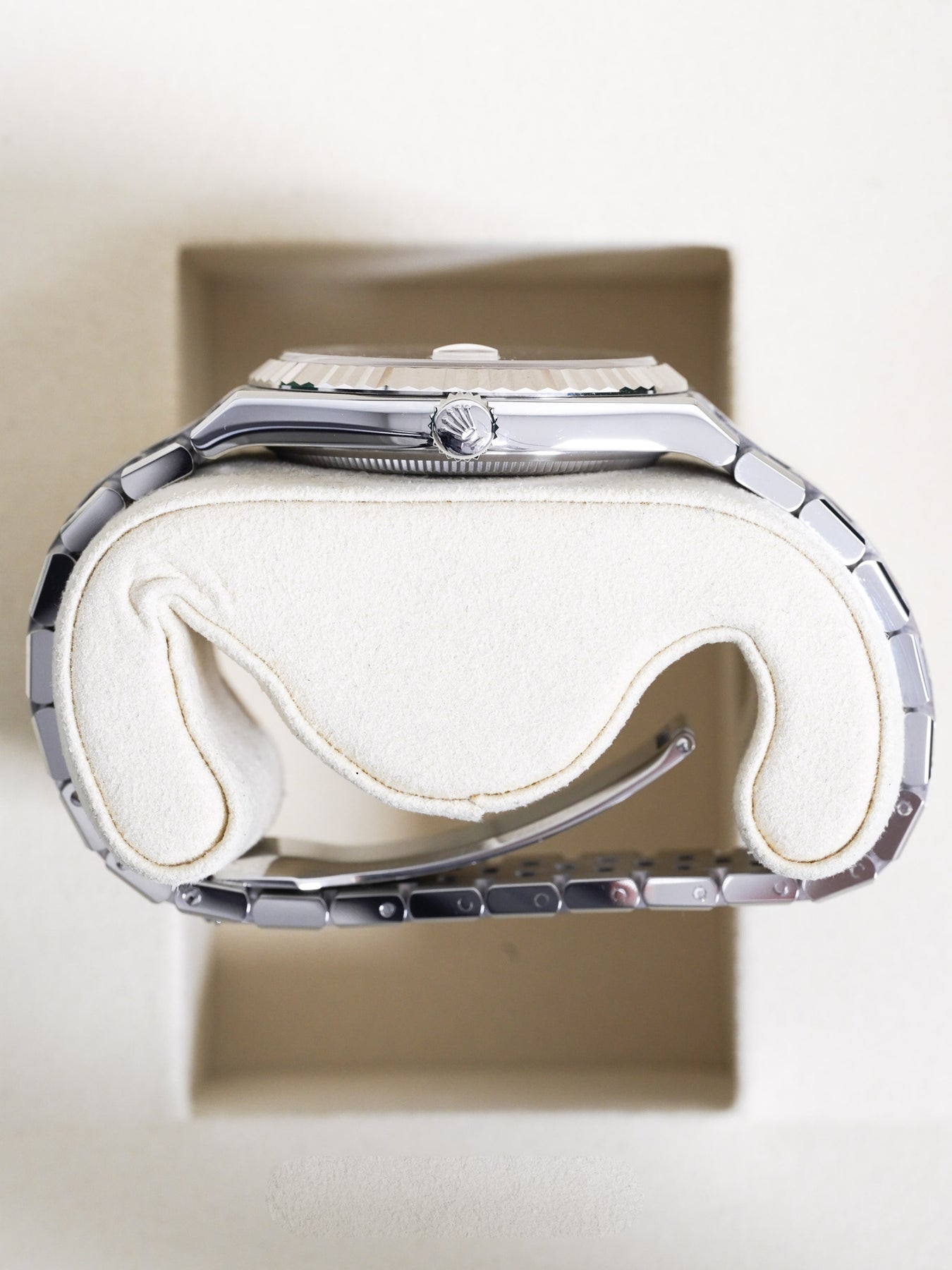40mm stainless steel case, white gold fluted bezel. Crown set on the right side of the watch as well as the date. White dial, stainless steel flat jubilee bracelet.