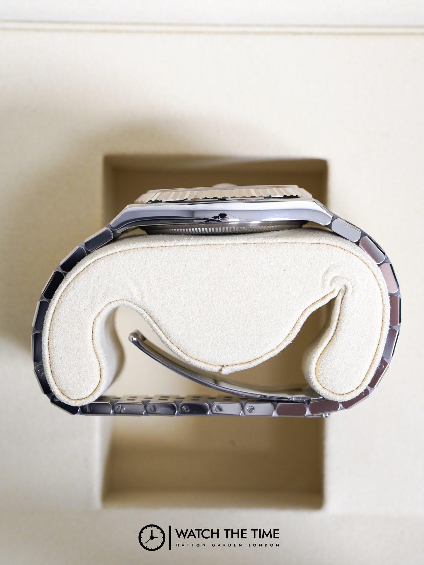 40mm stainless steel case, white gold fluted bezel. Crown set on the right side of the watch as well as the date. White honey-comb motif dial, stainless steel flat jubilee bracelet.