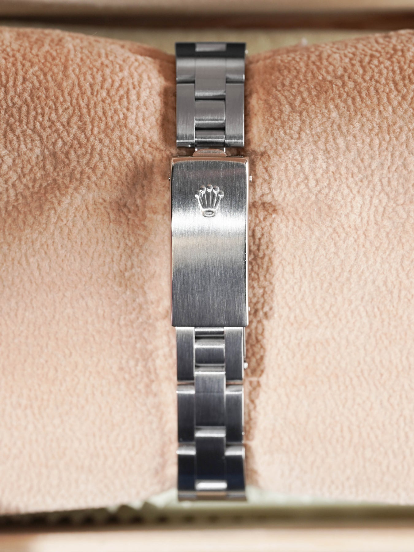 24mm stainless steel case, smooth bezel. Crown set on the right side of the watch. Black dial, stainless steel oyster bracelet.