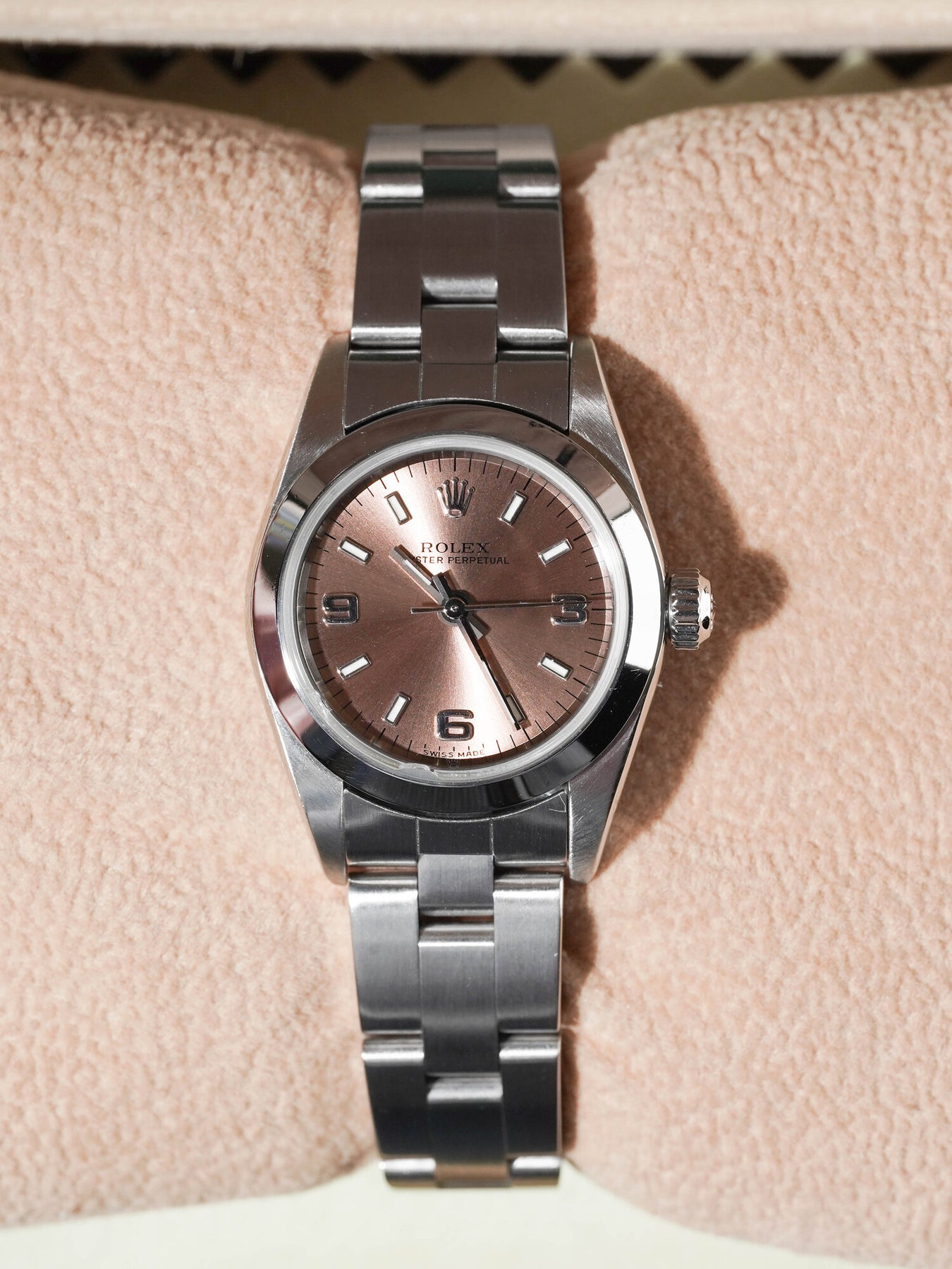 24mm stainless steel case, smooth bezel. Crown set on the right side of the watch. Pink dial, stainless steel oyster bracelet.