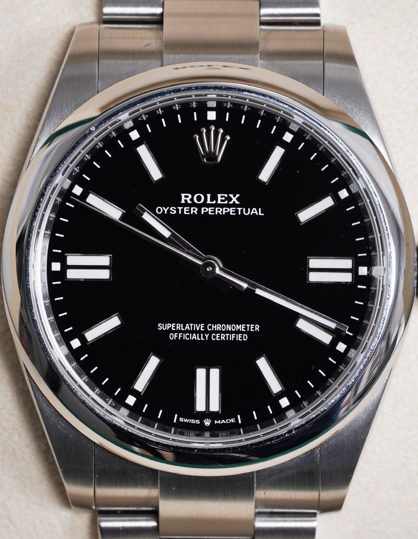41mm stainless steel case, smooth bezel. Crown set on the right side of the watch. Black dial, stainless steel oyster bracelet.
