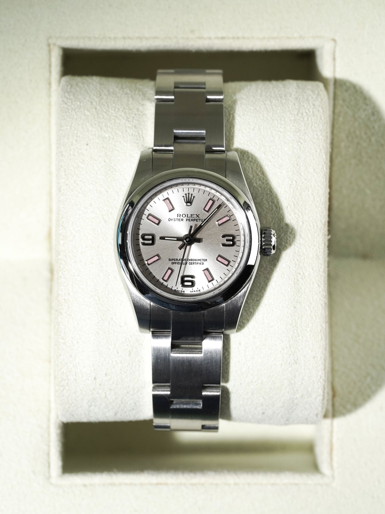 26mm stainless steel case, smooth bezel. Crown set on the right side of the watch. Silver dial, stainless steel oyster bracelet.